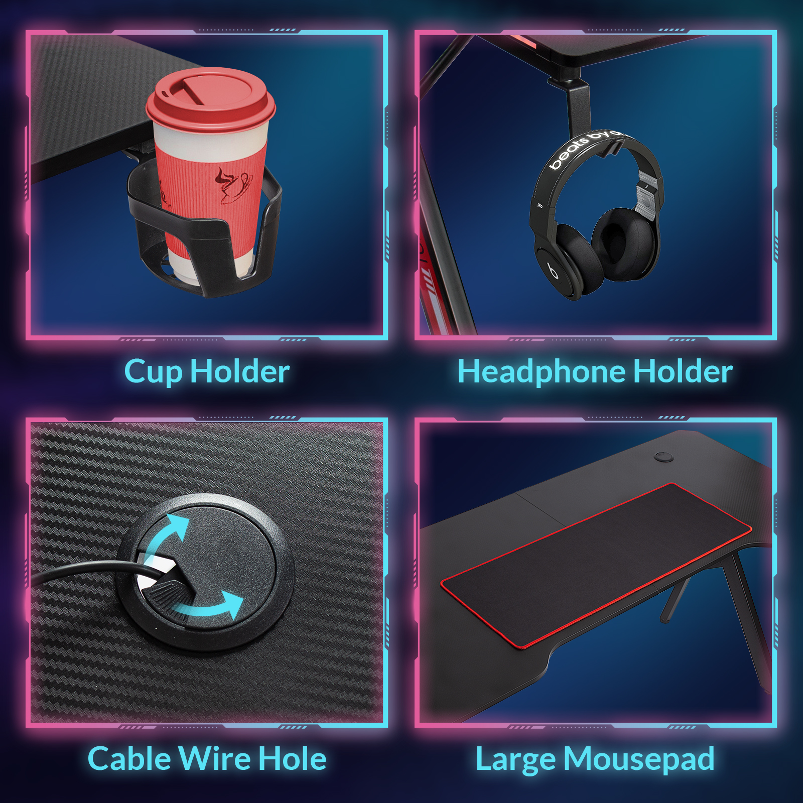 Accessoires réfléchis inclus - Le support de casque externe et le porte-boisson gardent vos essentiels à portée de main, éliminant ainsi le risque de renverser des boissons sur votre clavier. De plus, le bureau est doté de doubles ouvertures pour une gestion aisée des câbles. Un grand tapis de souris offre une vaste surface permettant des mouvements de souris sans entrave lors des sessions de jeu intenses.