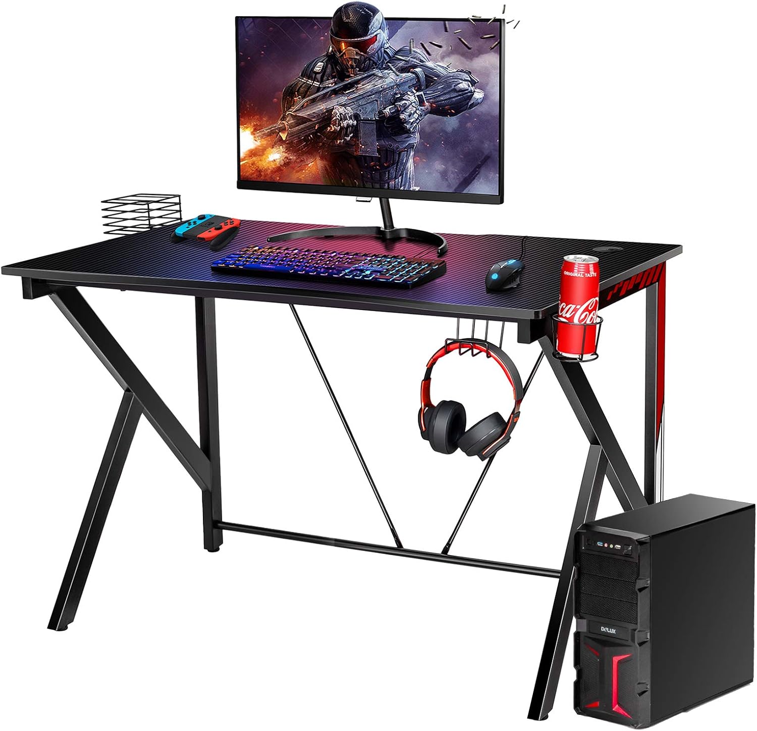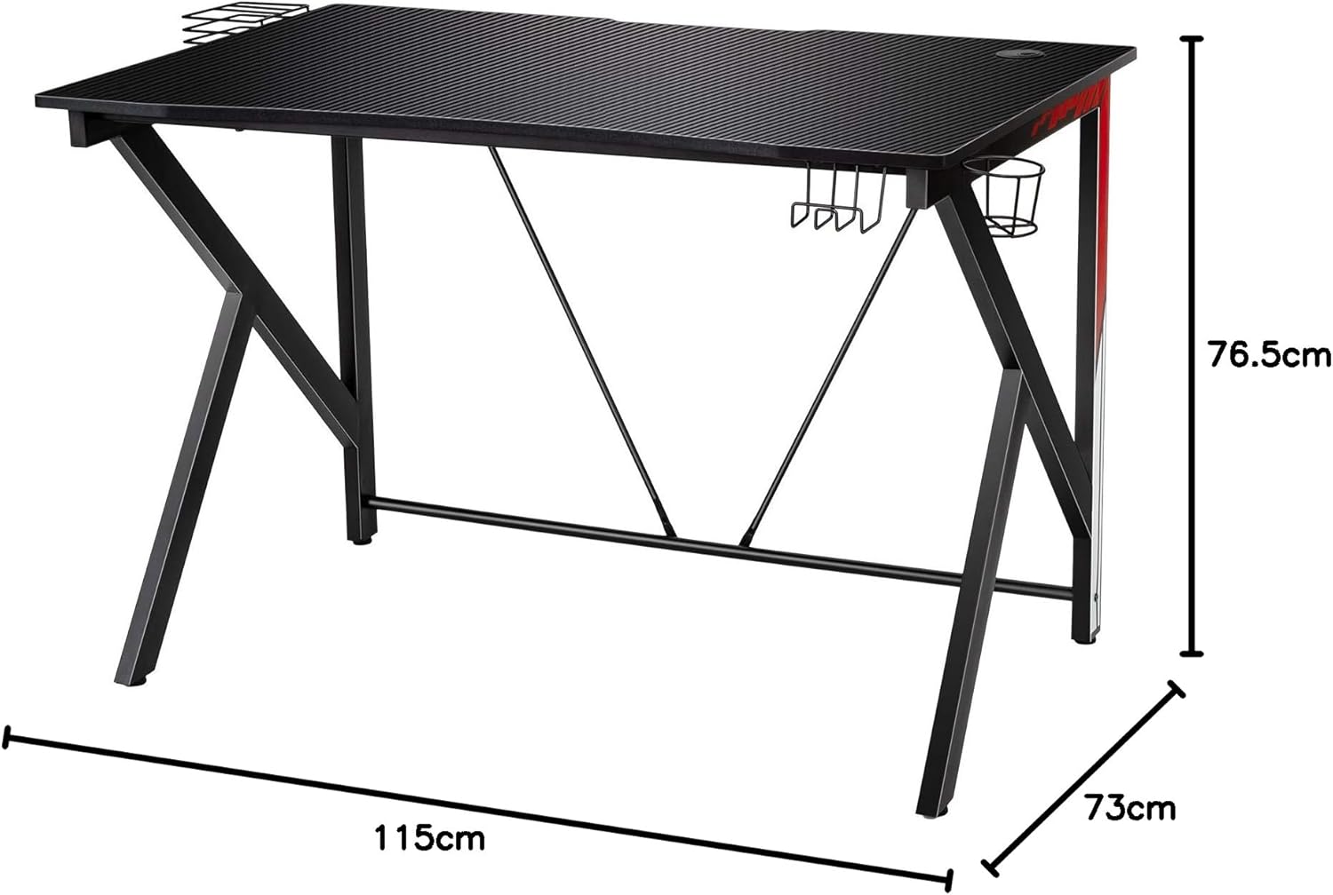 Vous recherchez un bureau gaming spacieux et de haute qualité ? Vous envisager notre table de jeu, dont la taille du plateau est de 115 x 73 cm, ce qui vous permet de placer votre moniteur, votre clavier, votre ordinateur, etc… Il contient un crochet pour casques, un porte-gobelets et une étagère de rangement pour disques. La table est fabriquée en panneaux de haute densité pour plus de durabilité. La structure en forme de K assure la stabilité et la charge jusqu'à 100 kg pour une utilisation à long terme. Elle peut également être utilisée comme table de travail.