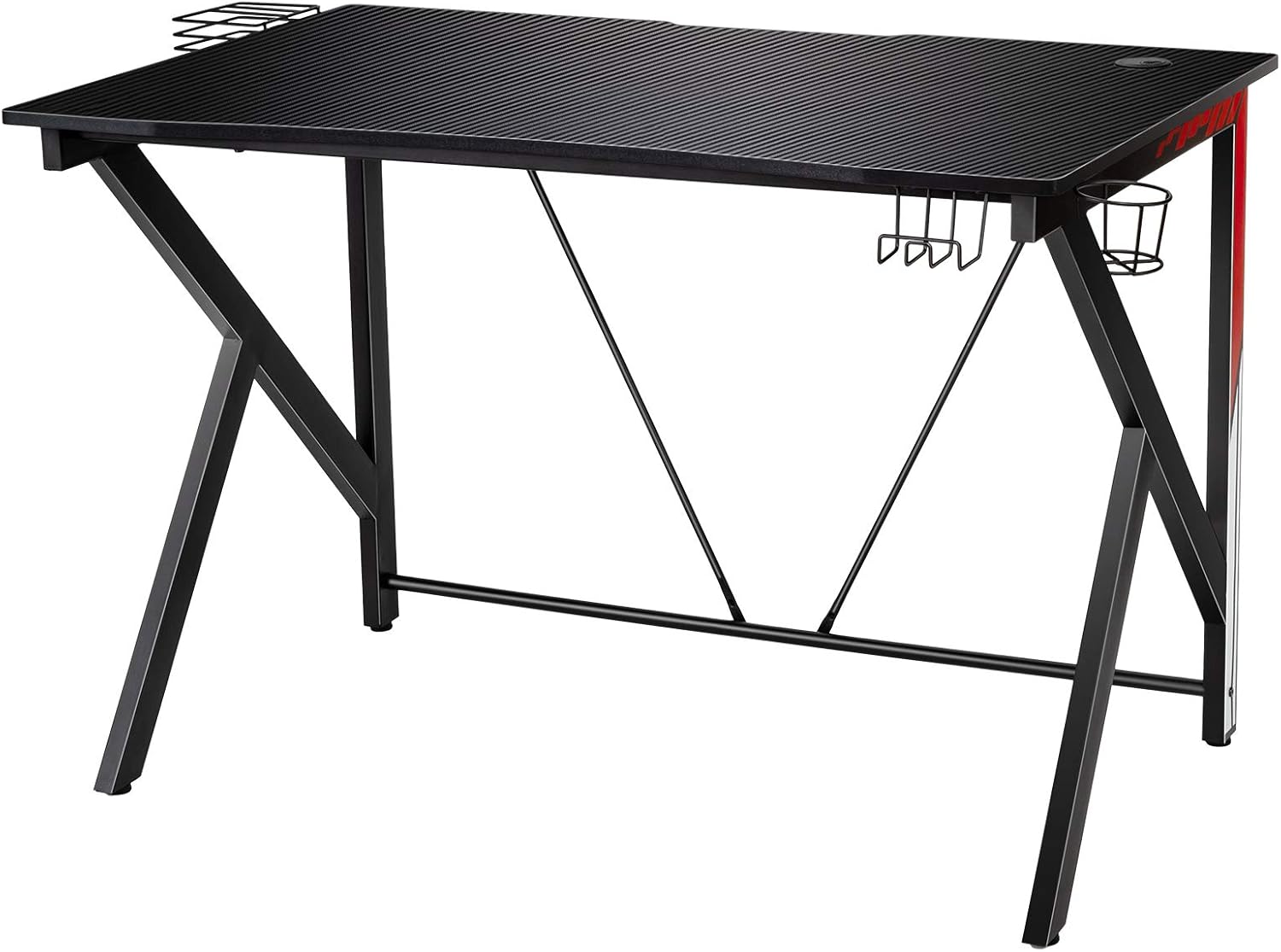 - Des équipements auxiliaires pratiques : Ce bureau est livré avec quelques équipements supplémentaires pour vous aider à améliorer votre expérience de jeu. Un crochet pour casque, un porte-gobelet et une tablette de rangement pour disque permettent aux joueurs de garder les objets essentiels à portée de main et de libérer de l'espace sur le bureau. Un passe-câble permet de garder tous les cordons bien rangés.