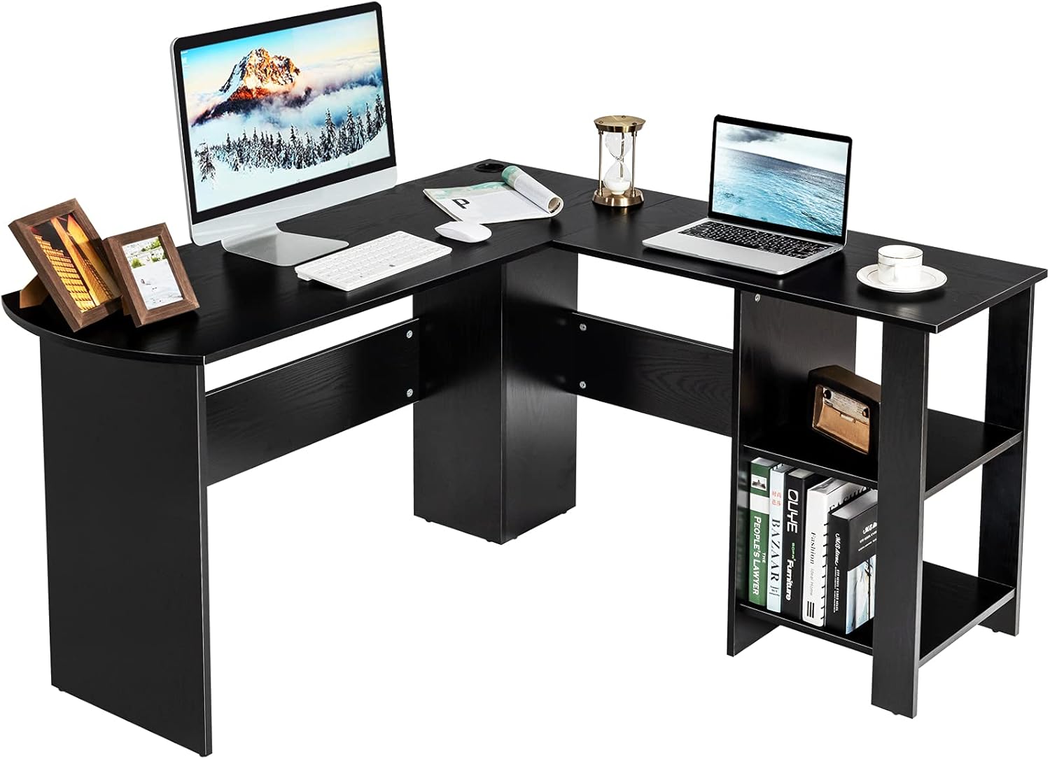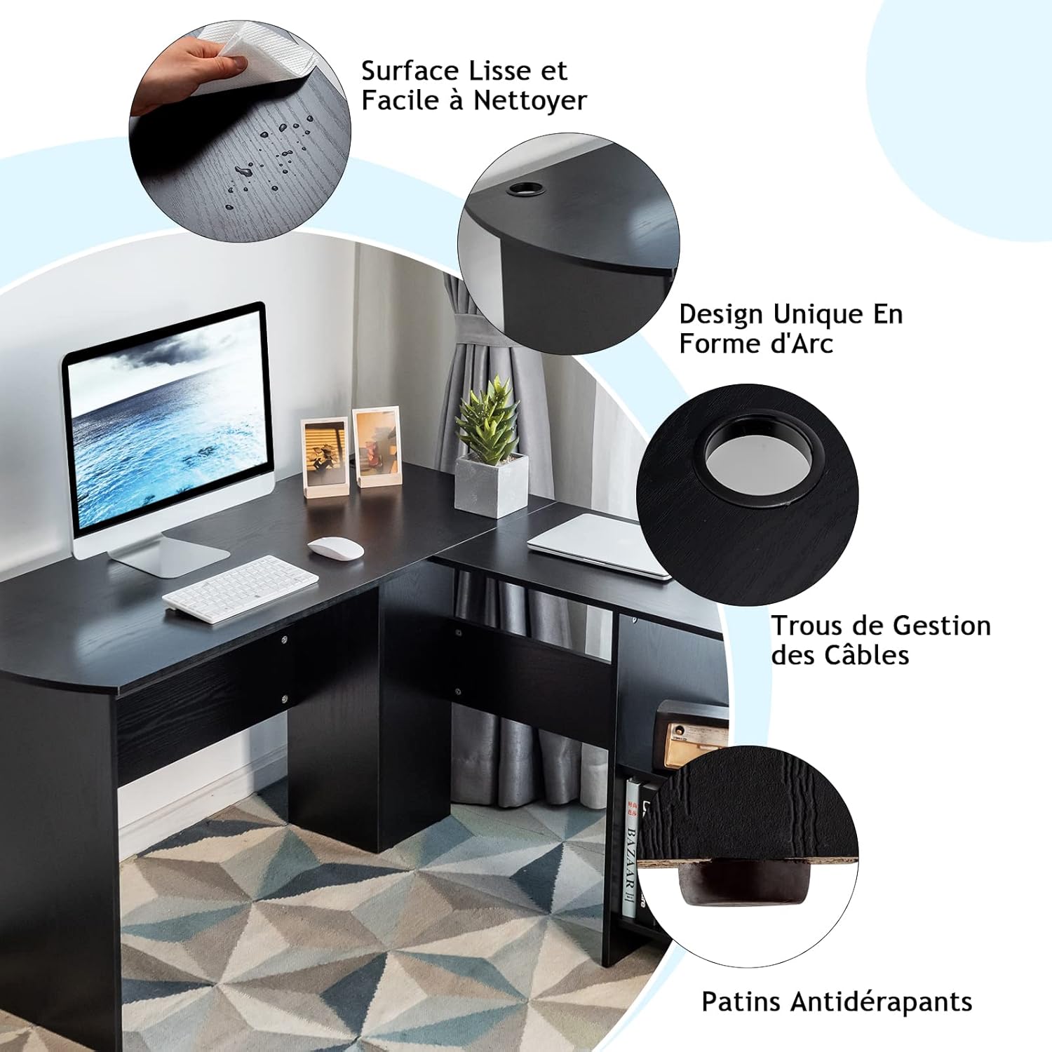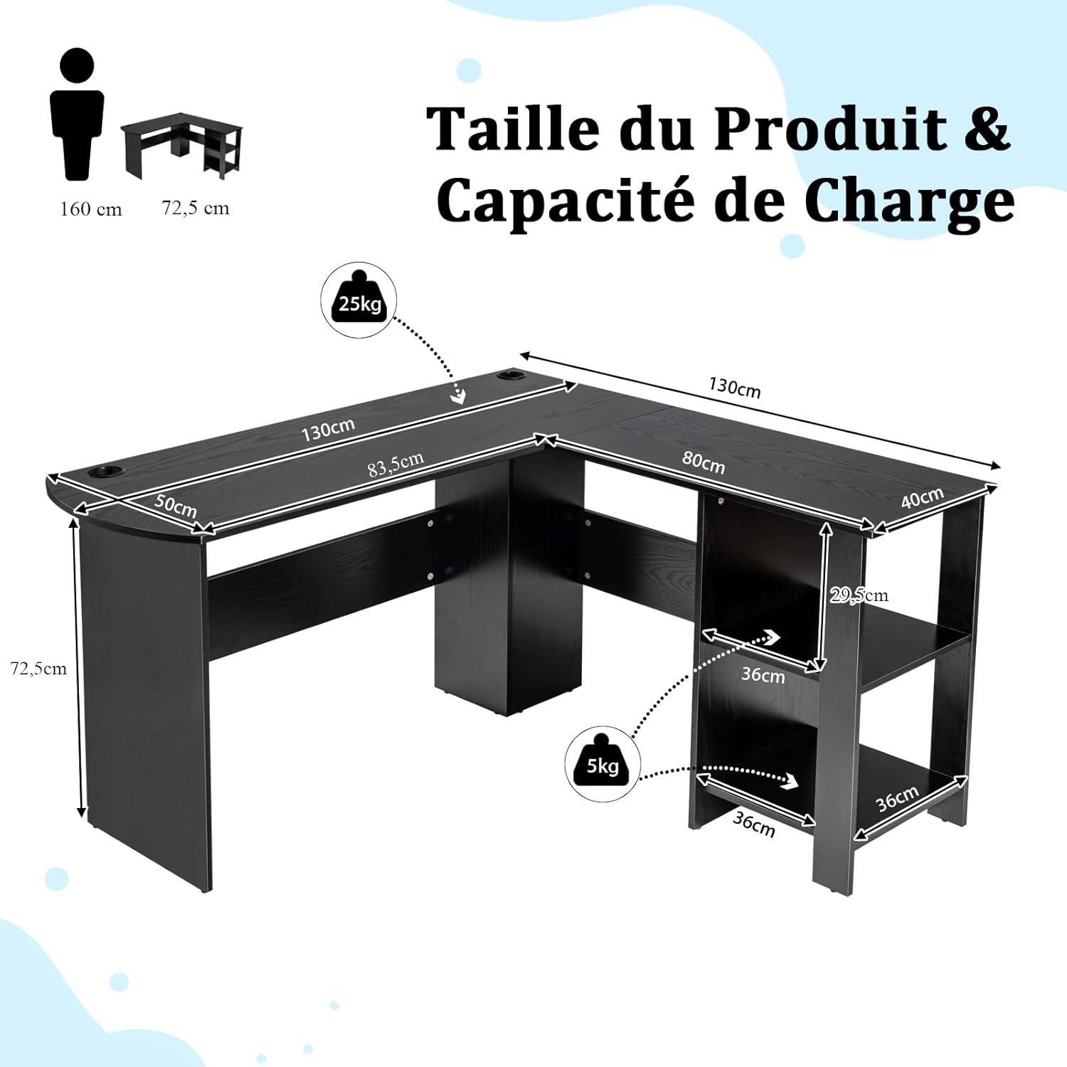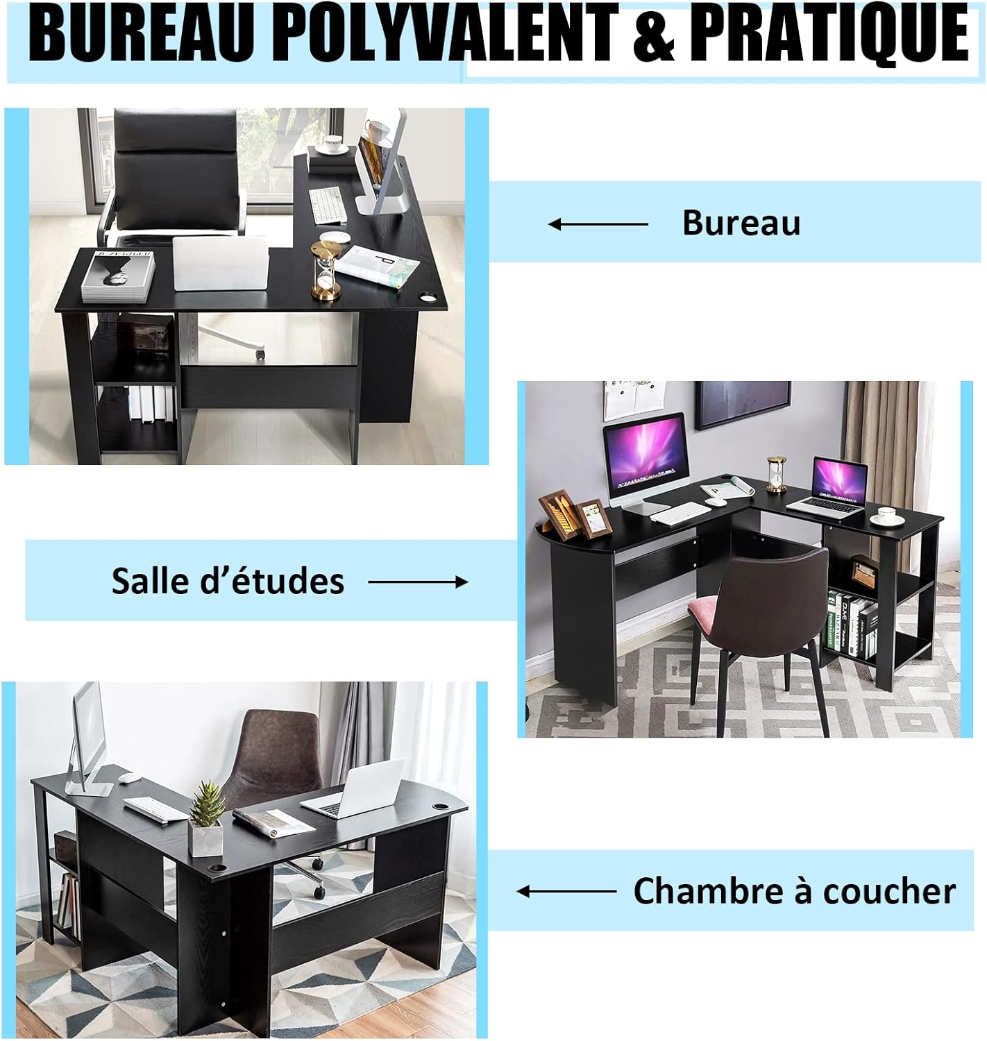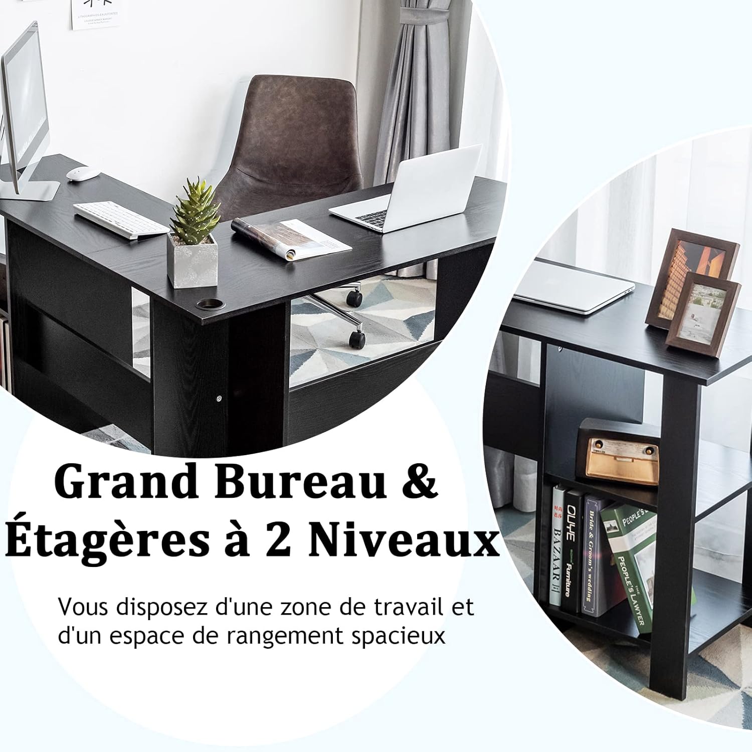 | Libellé | Bureau informatique coin avec étagère ouvertes à 2 niveaux, table de bureau en forme de l noir |