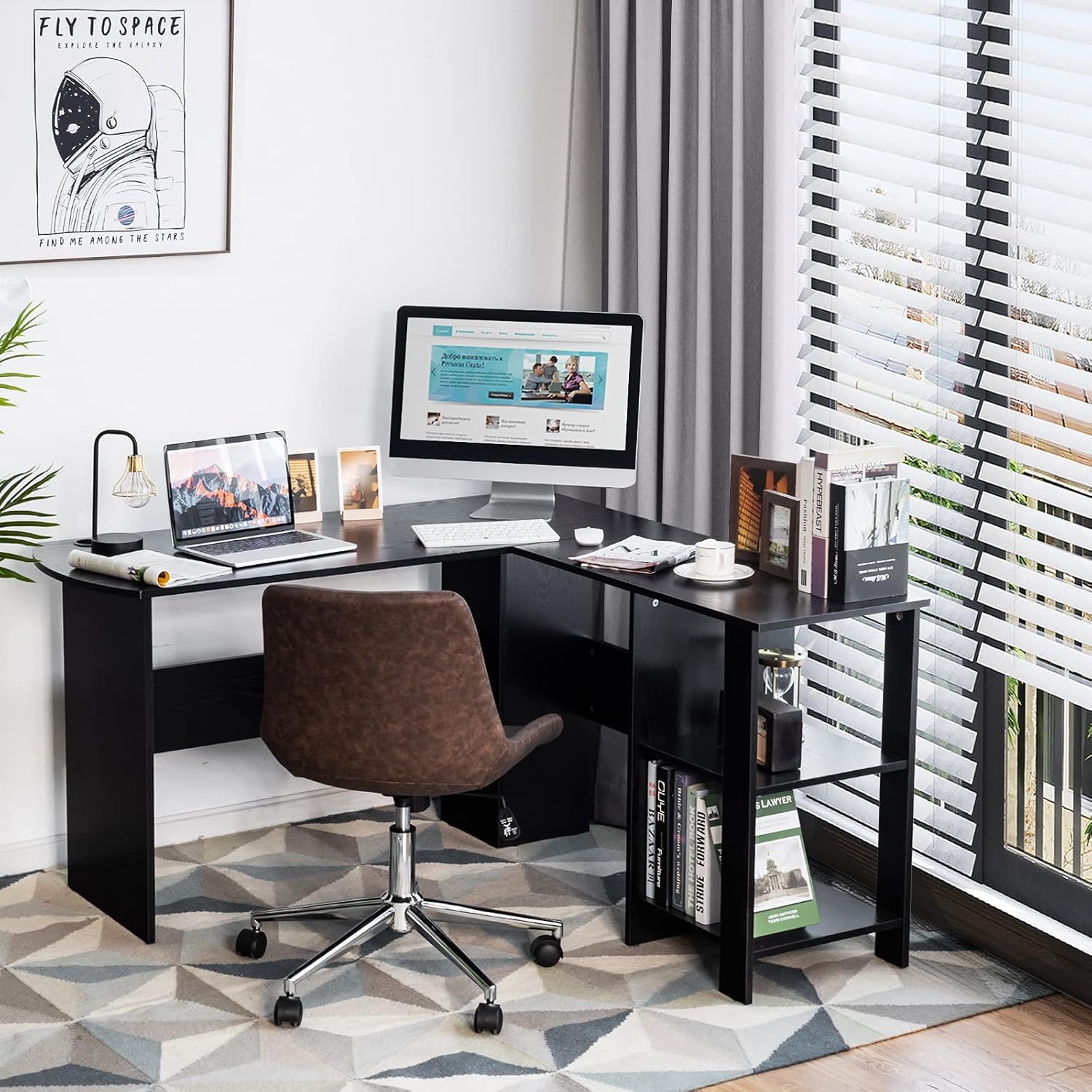 Bureau informatique coin avec étagère ouvertes à 2 niveaux, table de bureau en forme de l noir