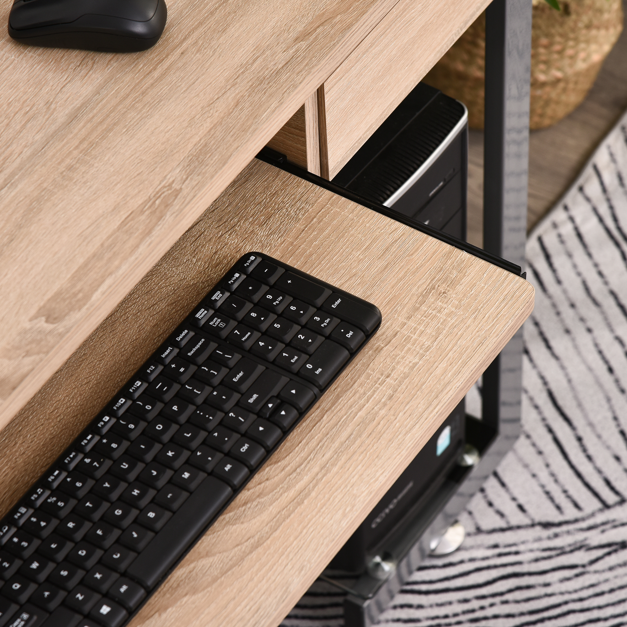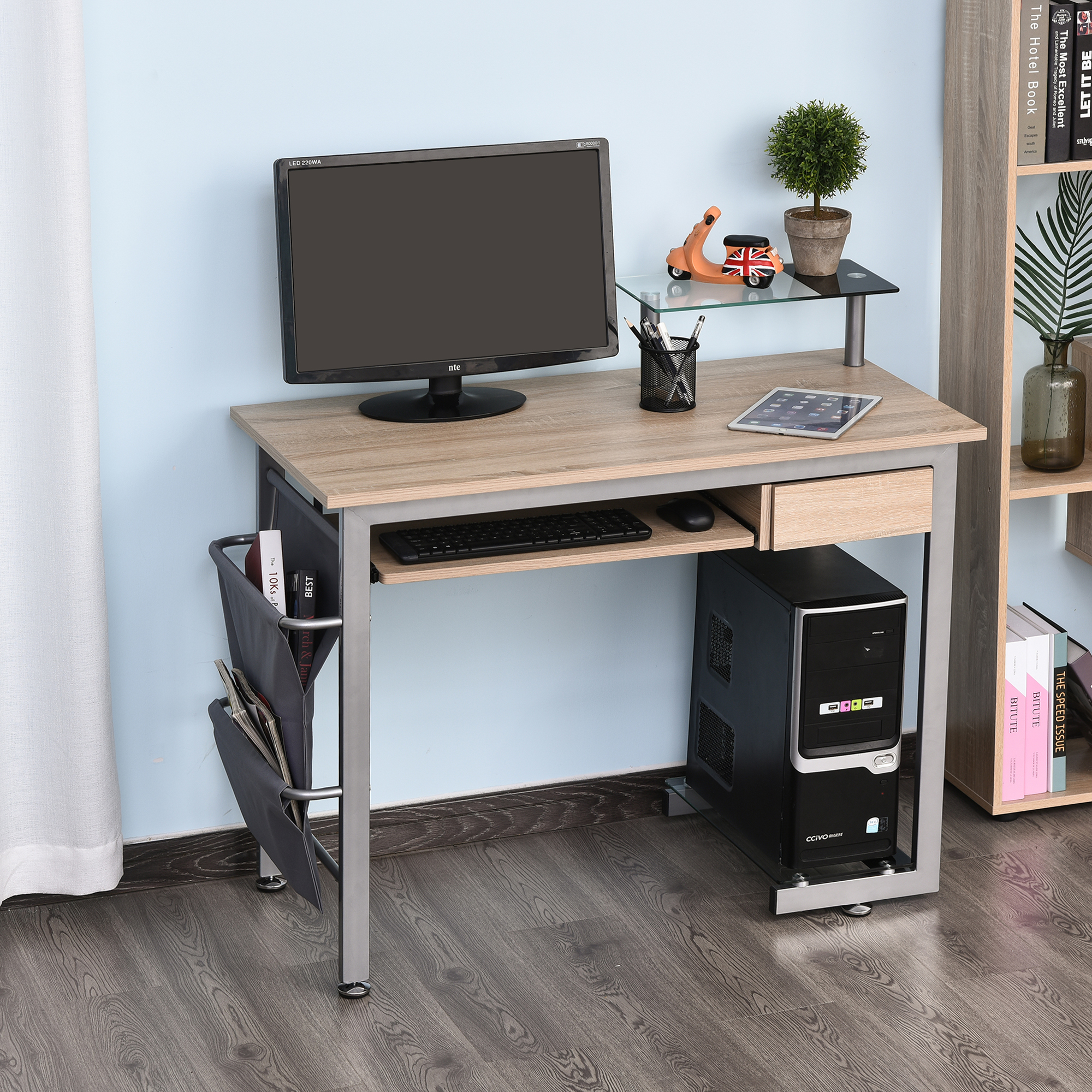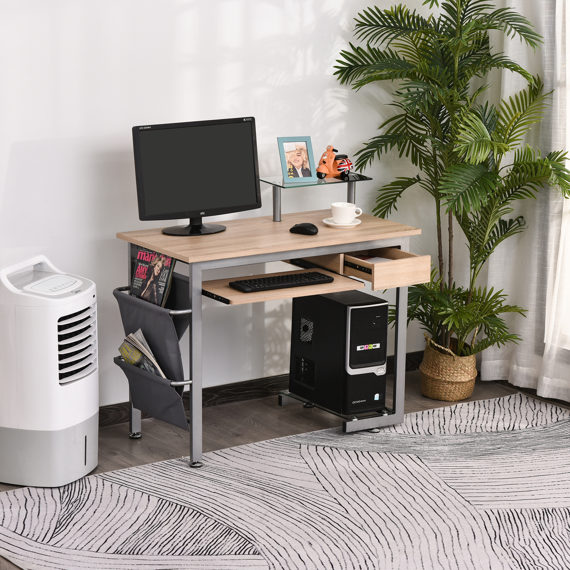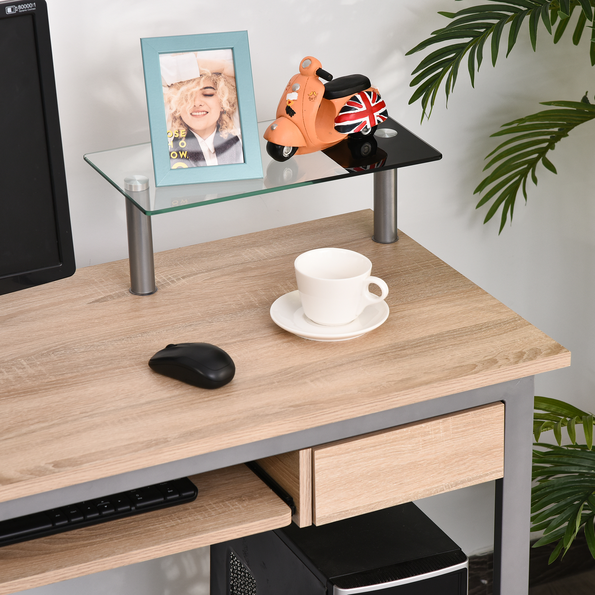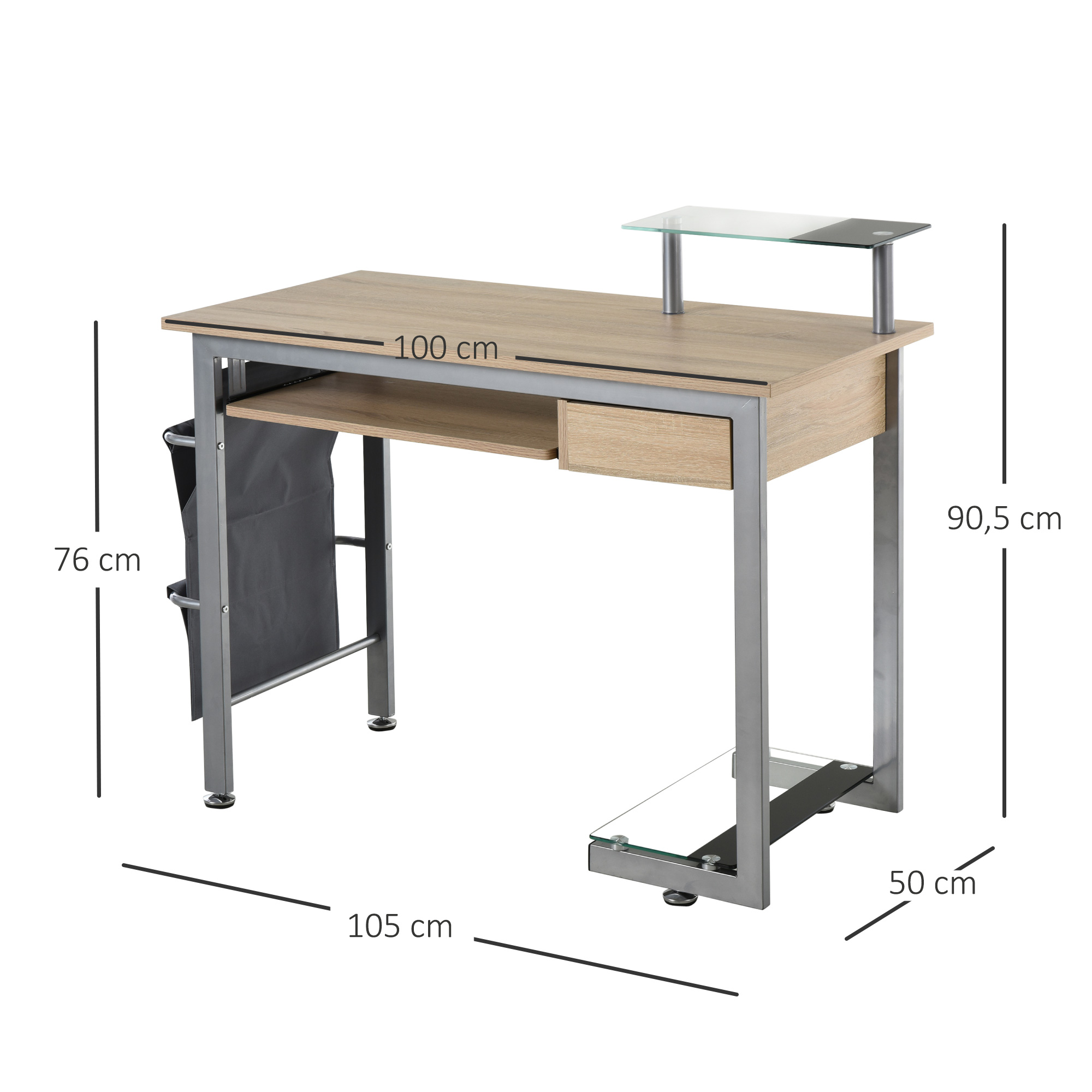- Multi-rangements : tablette coulissante, tiroir coulissant, 2 étagères en verre (une pour votre imprimante, l'autre pour unité centrale), double pochette latérale