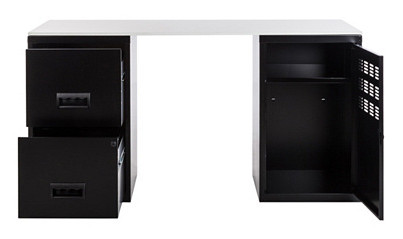 Ce beau modèle de bureau métal noir de style industriel de la collection Logis ajoutera une note d’élégance à votre intérieur. Fabriqué en métal haut de gamme, la structure de ce bureau est extrêmement stable et robuste et son plateau en bois MDF de très bonne qualité. Plusieurs rangements sont à votre disposition dont 1 porte et 2 tiroirs. 1 colonne de deux tiroirs avec serrure (p.40xl.40xh.57cm) - 1 casier à porte avec serrure et tablette réglable 32 cm ou 47 cm (p.40xl.40xh.57.5cm) Structure noir 1 plateau en mélaminé blanc épaisseur 12mm Classé non feu M1 (combustible non inflammable) Fabrication Française - Garantie 2 ans