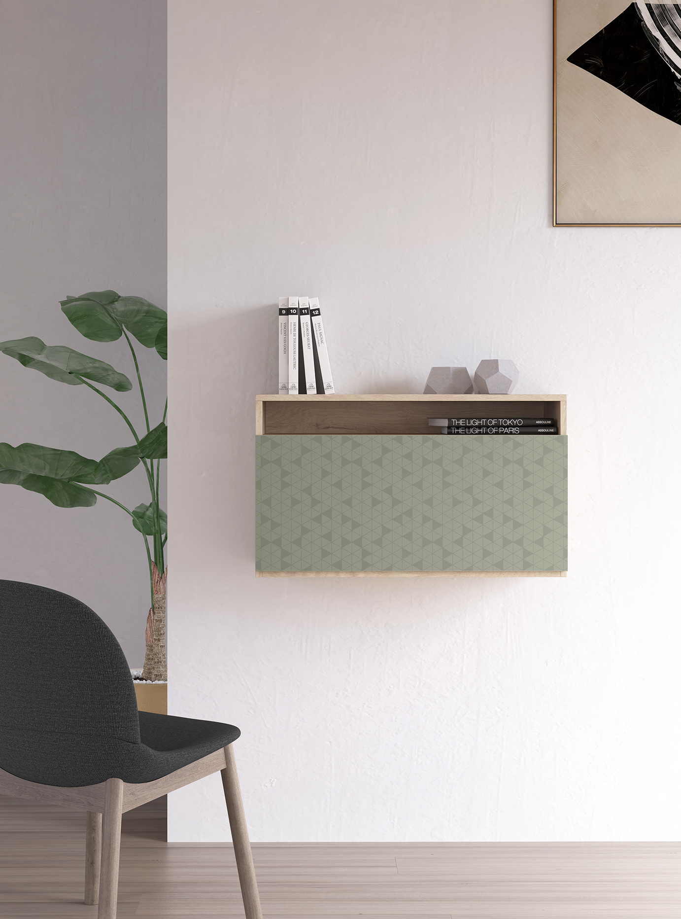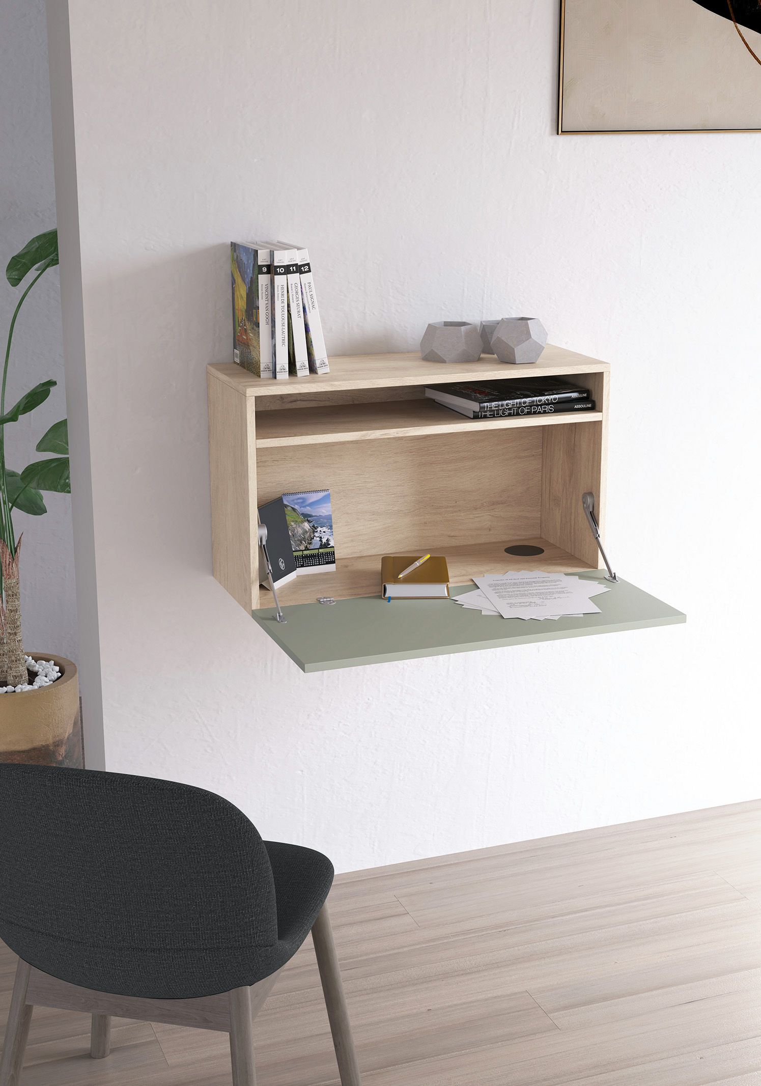 Bureau mural, modèle OPORTO, en mélamine, avec porte pliable sérigraphié. Chêne clair et Vert Geo1