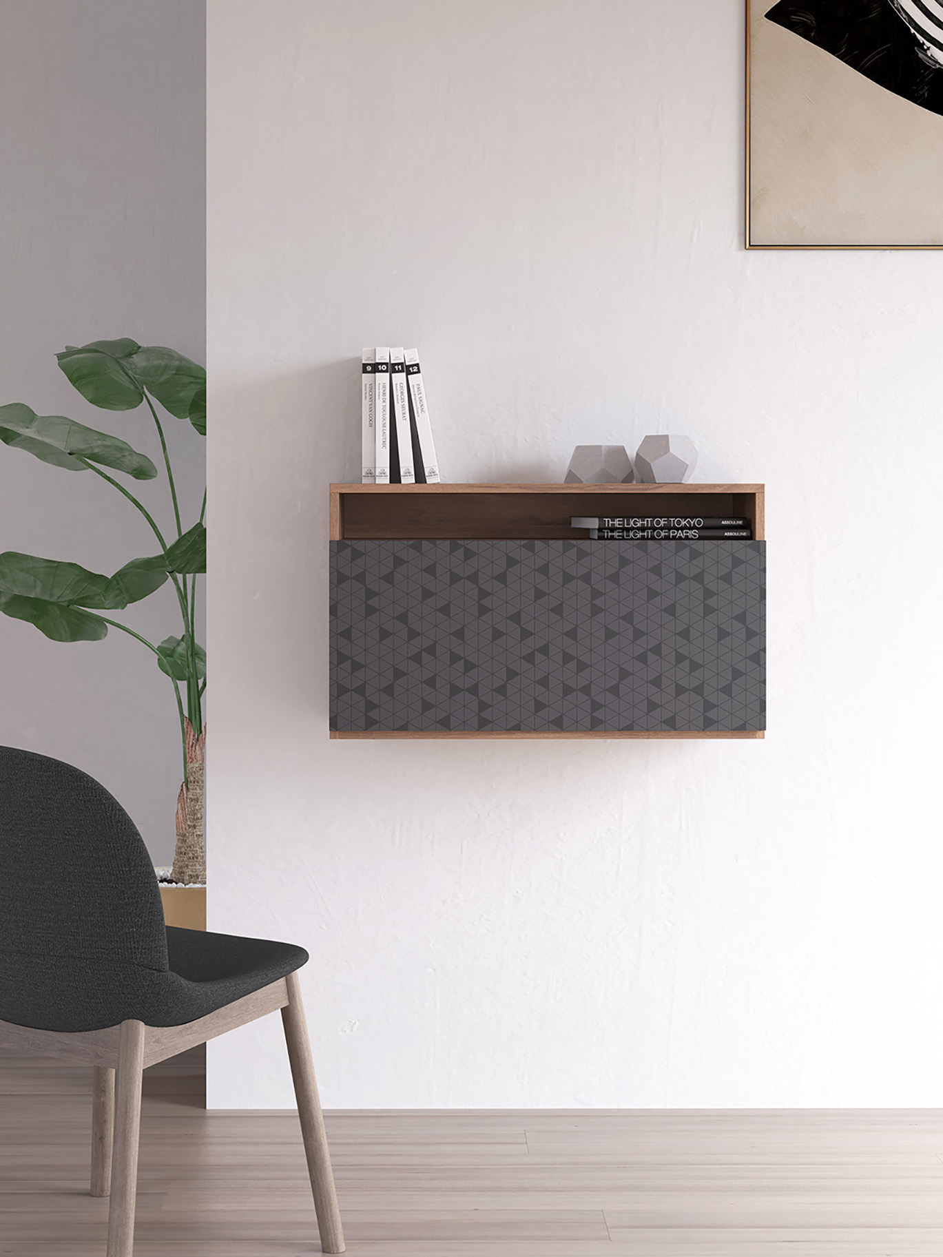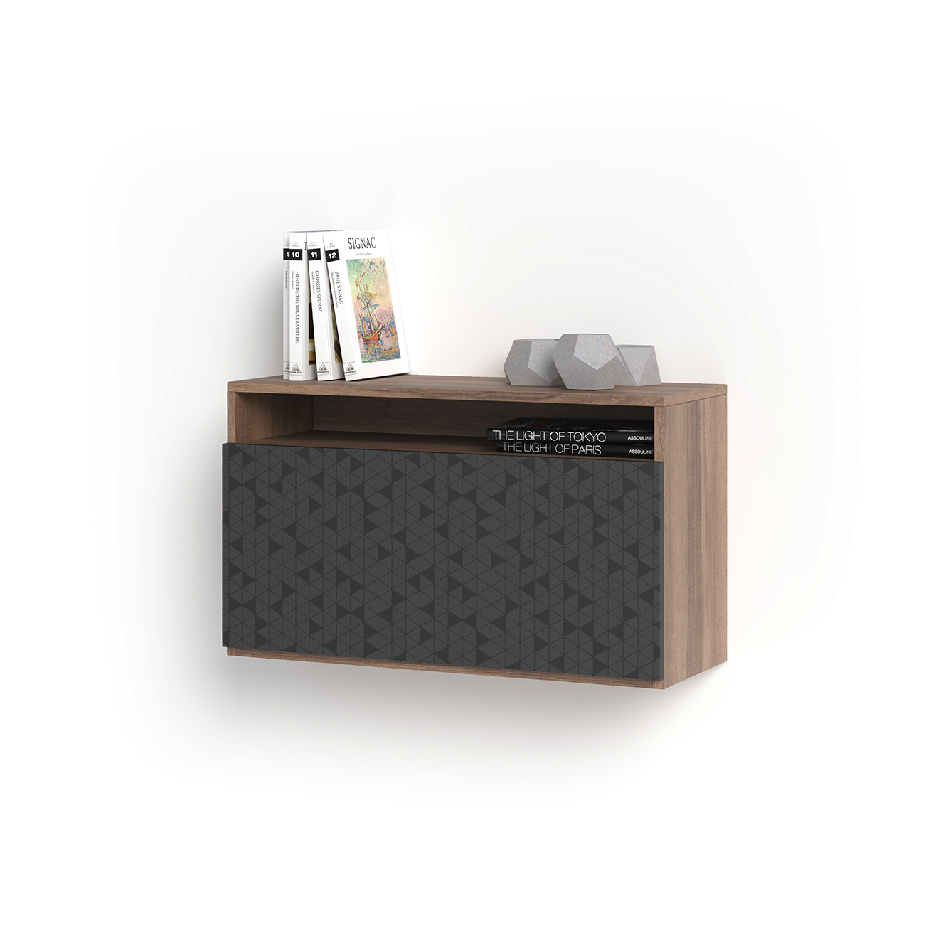 Bureau mural, modèle OPORTO, en mélamine, avec porte pliable sérigraphié. Noyer et Graphite Geo1