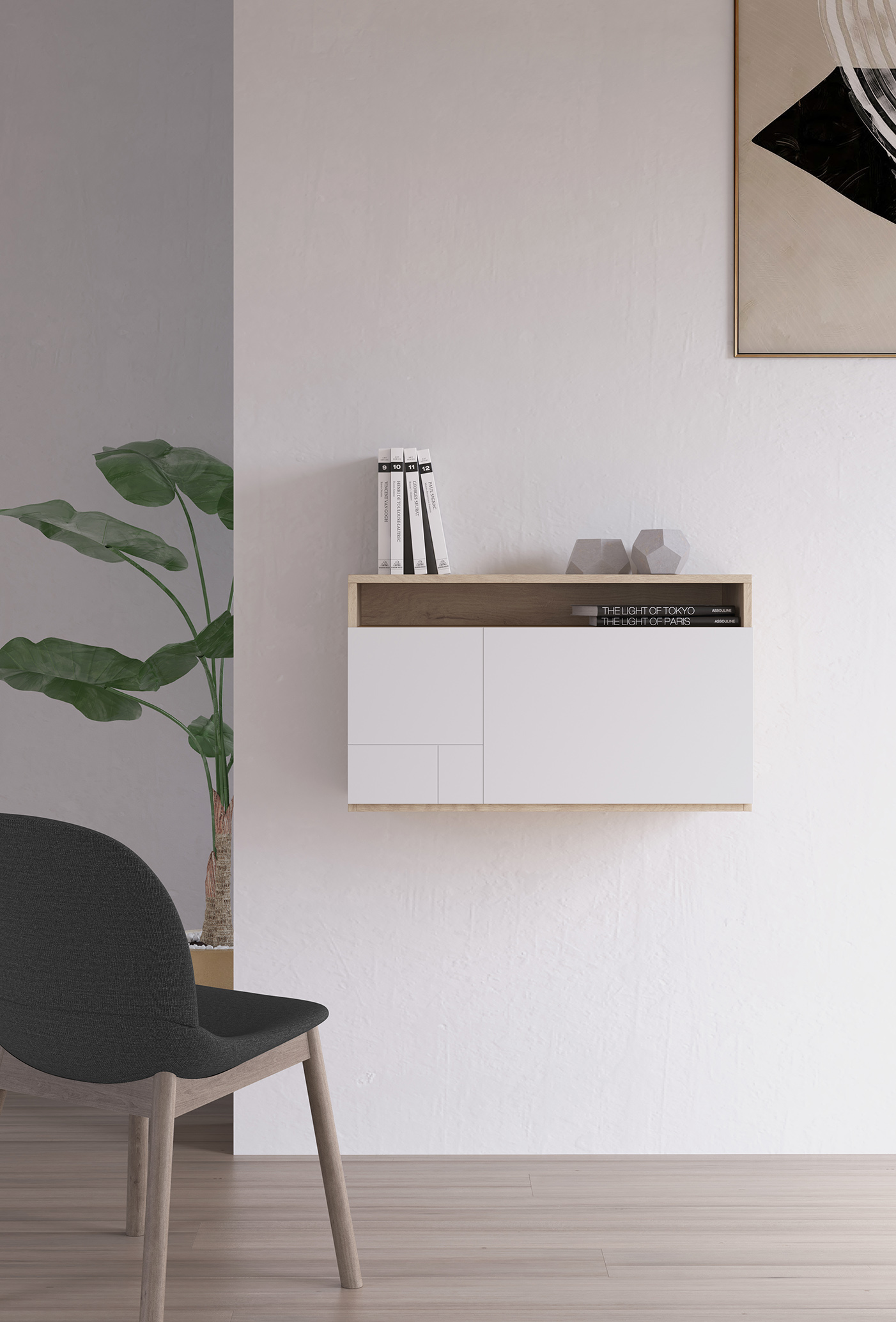 Bureau mural en mélamine avec porte pliable. La simplicité et ses dimensions contribueront à créer une place confortable idéale pour travailler ou étudier dans un espace réduit. Le design permet de l'utiliser aussi comme console dans l'entrée ou comme meuble de rangement dans le salon ou la chambre.