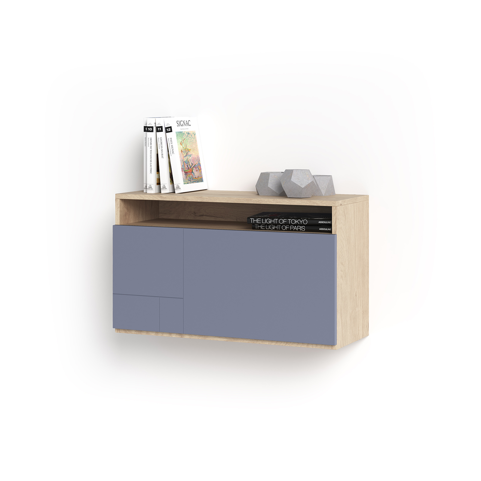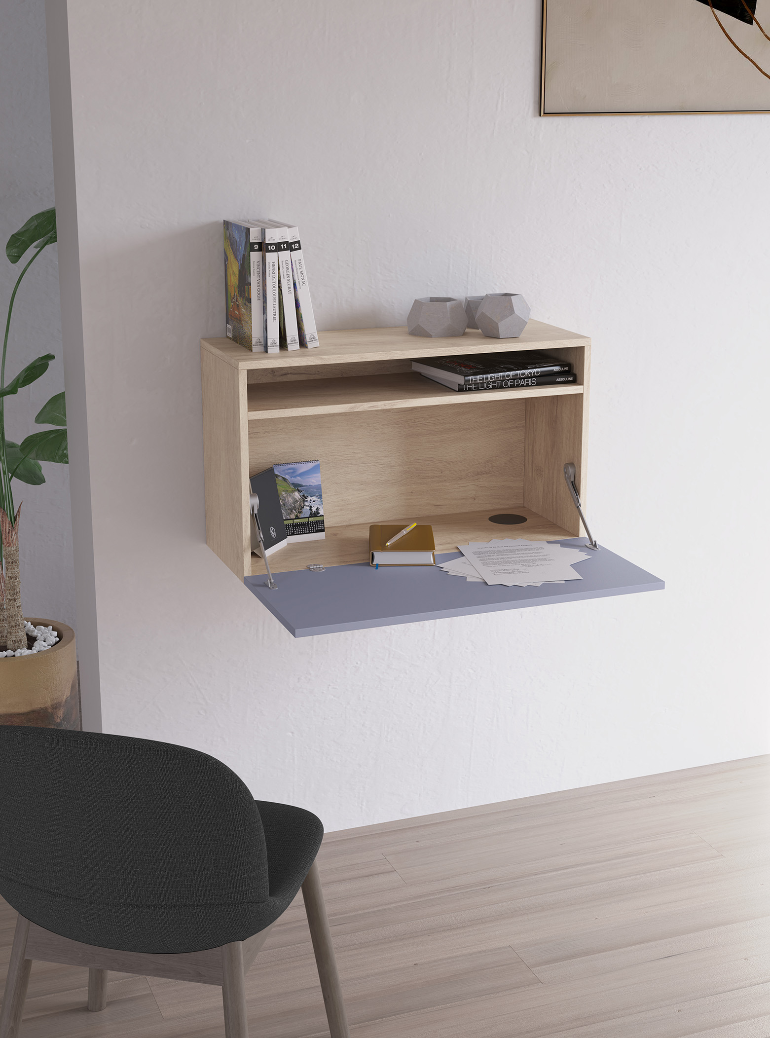 Bureau mural, modèle OPORTO, en mélamine avec porte rabattable. Chêne clair et bleu