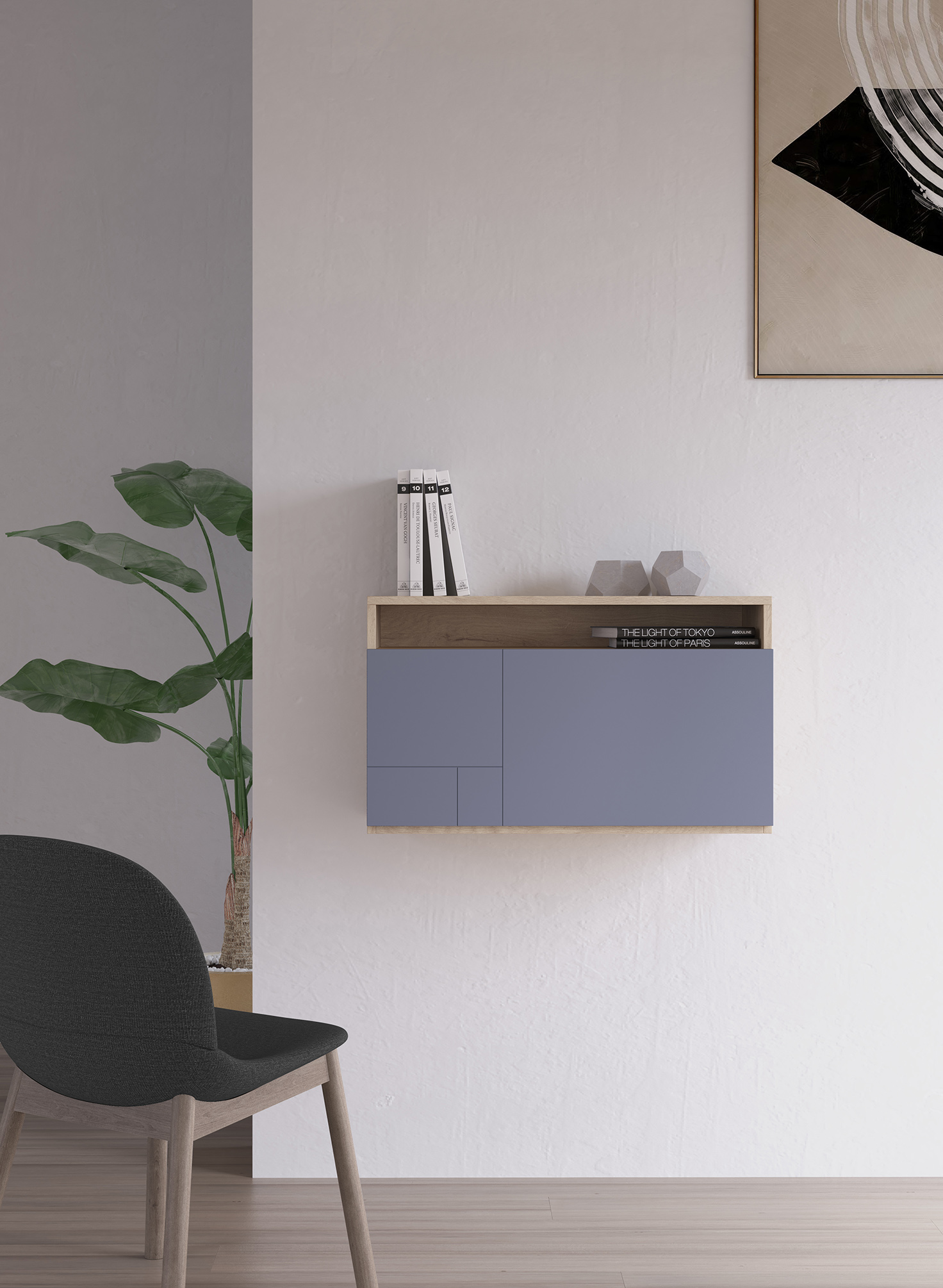 | Libellé | Bureau mural, modèle OPORTO, en mélamine avec porte rabattable. Chêne clair et bleu |