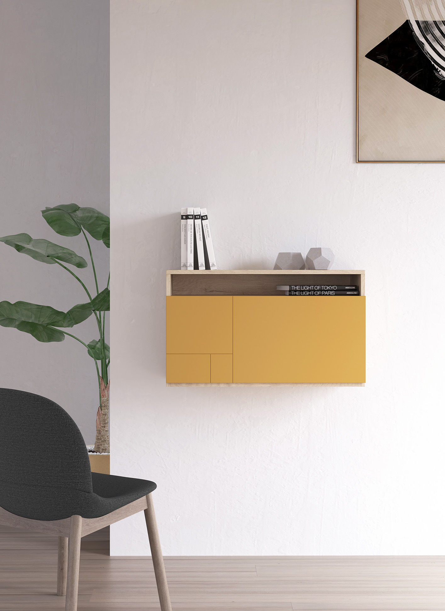 | Libellé | Bureau mural, modèle OPORTO, en mélamine avec porte rabattable. Chêne clair et Moutarde |