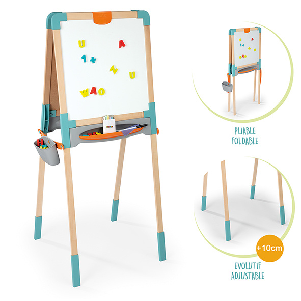 Bureau ergonomique Petit Ecolier. Caractéristiques : - Ardoise double face amovible : un côté noir pour les craies, et une face magnétique blanche pour écrire au feutre effacable - Grand bac de rangement sous l'ardoise - Qualité Smoby : robuste et stable. Pieds en plastique soufflé pour une meilleure stabilité - Ergonomique pour les enfants, avec notamment une traverse pour les pieds - Accessoires : 72 lettres et chiffres magnétiques, poubelle/bac à lettres, 1 feutre effacable, 6 craies et 1 chiffonnette.