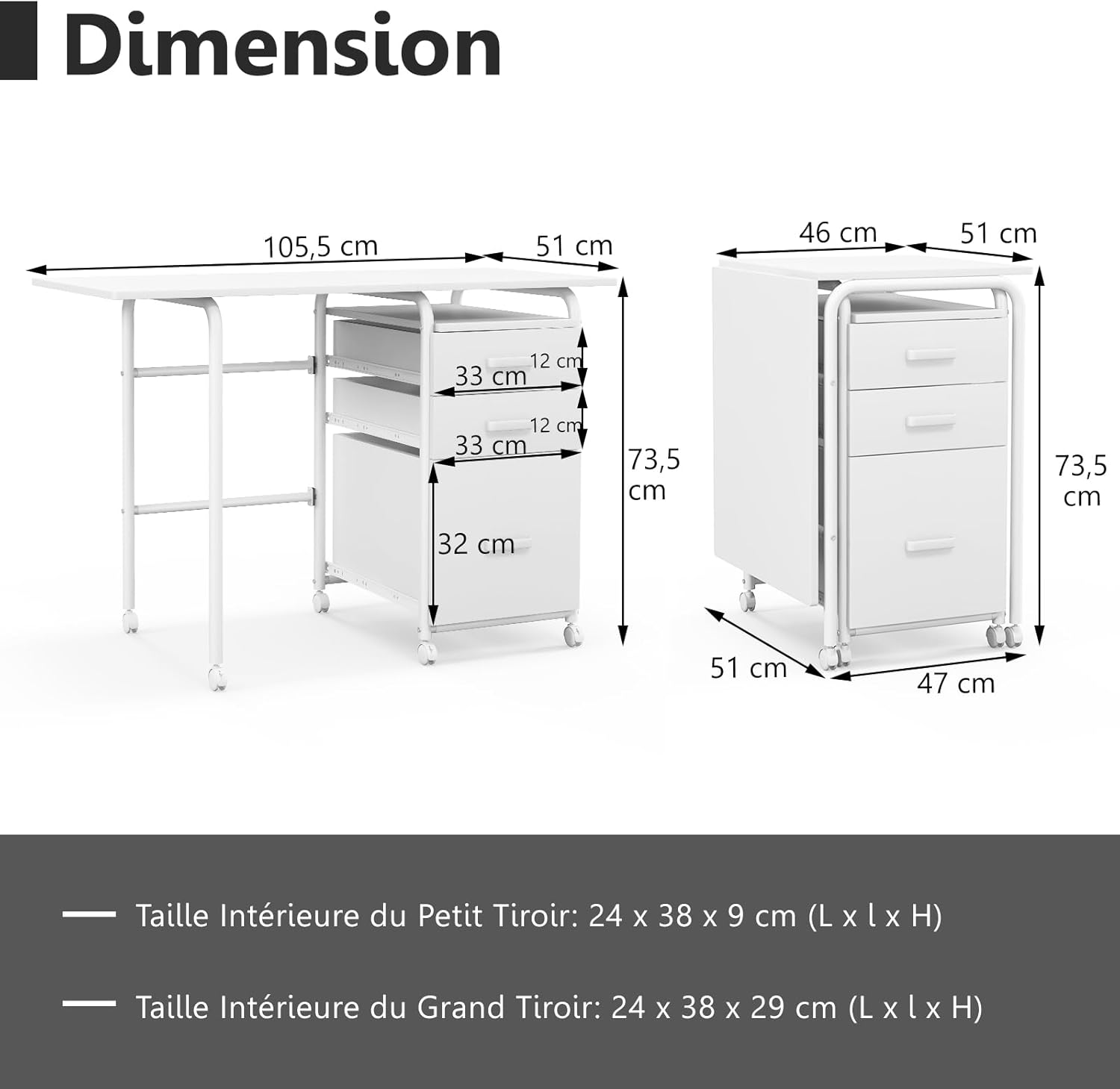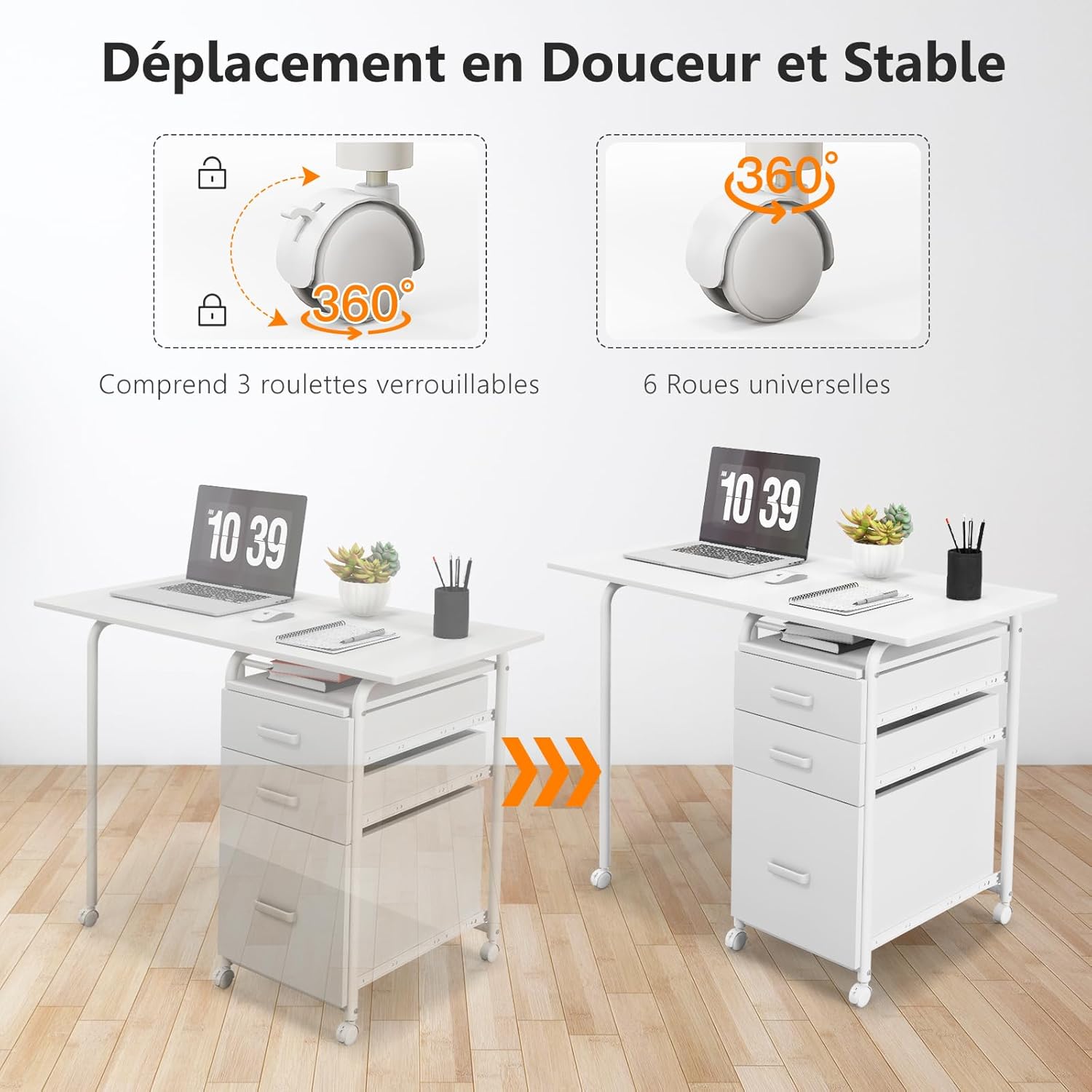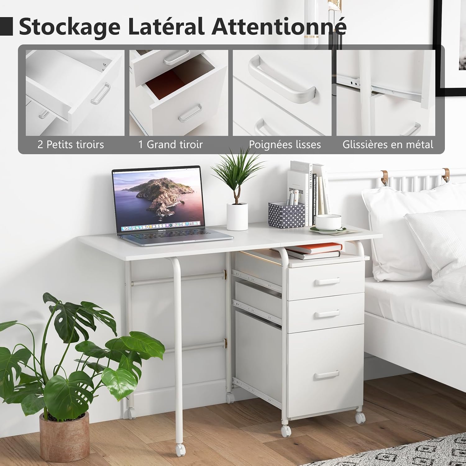 | Libellé | Bureau pliable 3 tiroirs de rangement & roues verrouillables, table roulante compacte cadre métal, blanc |