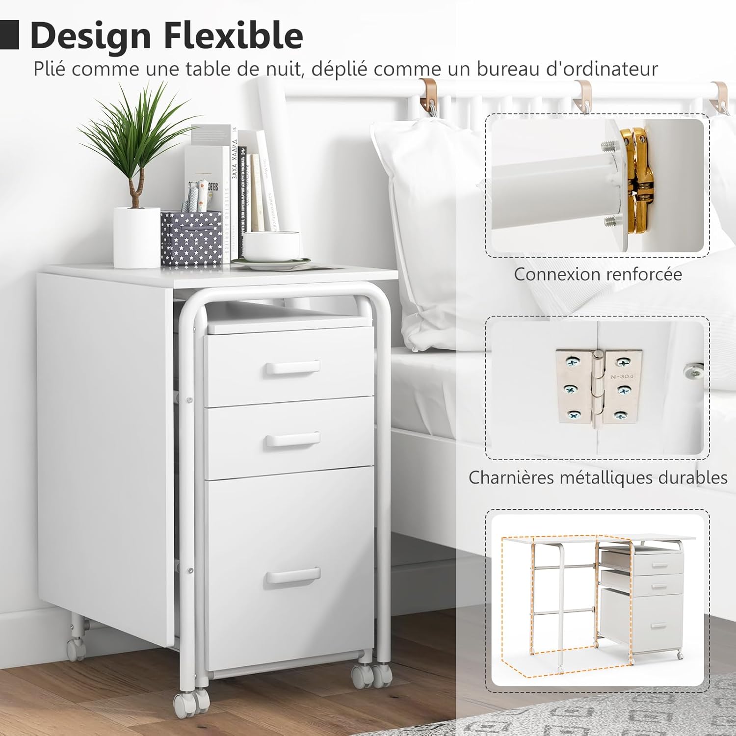 Bureau pliable 3 tiroirs de rangement & roues verrouillables, table roulante compacte cadre métal, blanc