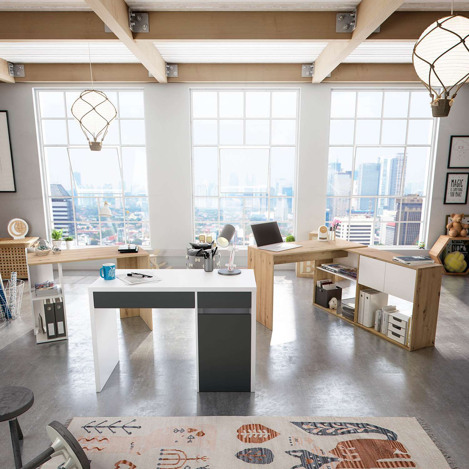 Bureau réversible en mélaminé coloris blanc artik et chêne. Dimensions: Hauteur 78 x Longueur 100 cm x Profondeur 52 cm Dimensions Étagère : Hauteur 137 x Longueur 71,5 x Profondeur 33 cm Matériel: Mélamine Poids maximum supporté : 25 kg Poids maximum des tiroirs supportés: 3 kg Couleur : blanc Artik et chêne