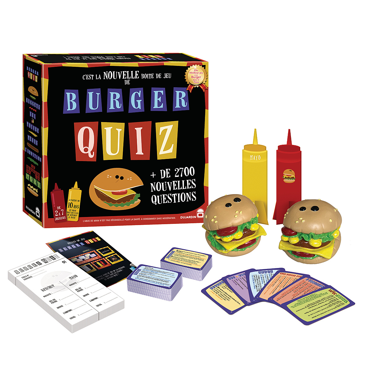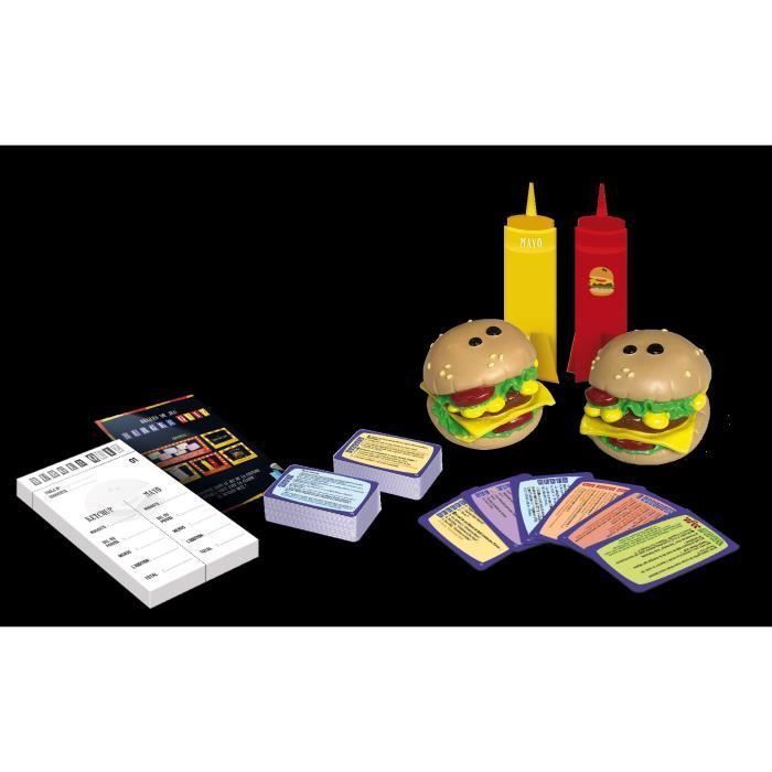 | La boîte contient | - 330 cartes avec les différentes épreuves - 2 burgers buzzer en plastique - 1 bloc points - 2 totems équipes Mayo et Ketchup - RDJ |