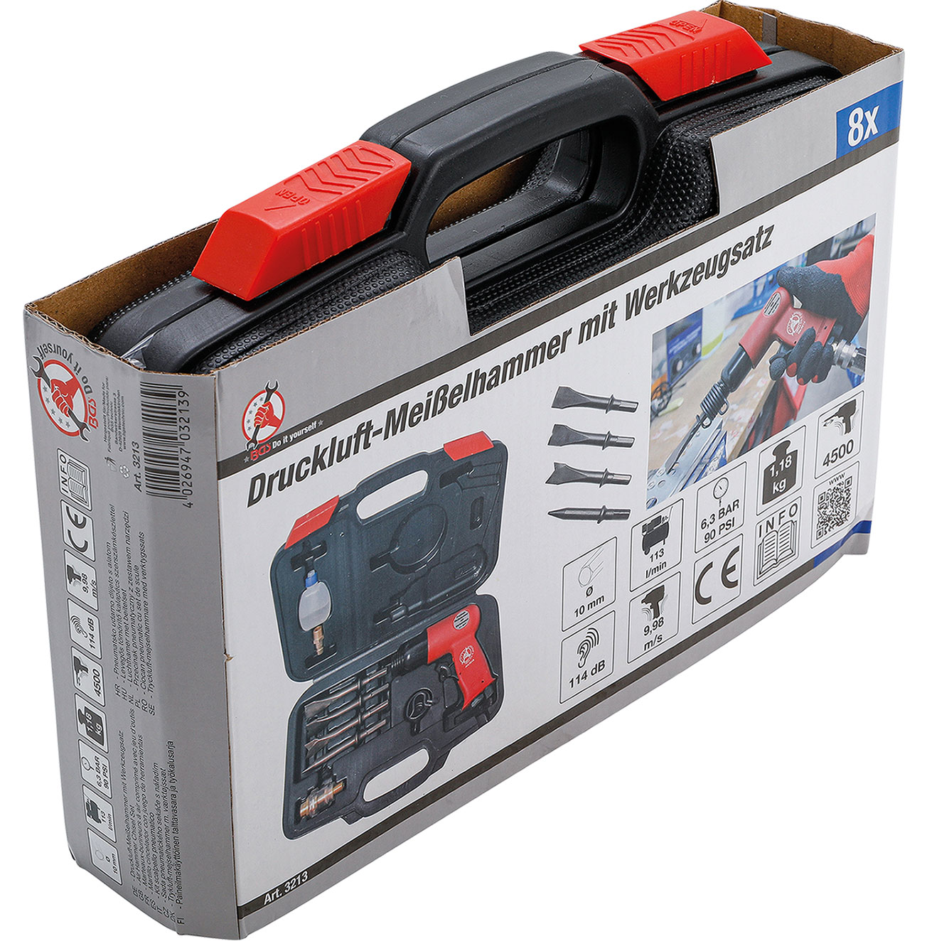 Le marteau burineur pneumatique est livré avec un jeu de 4 burins et un embout m le pour raccord rapide.