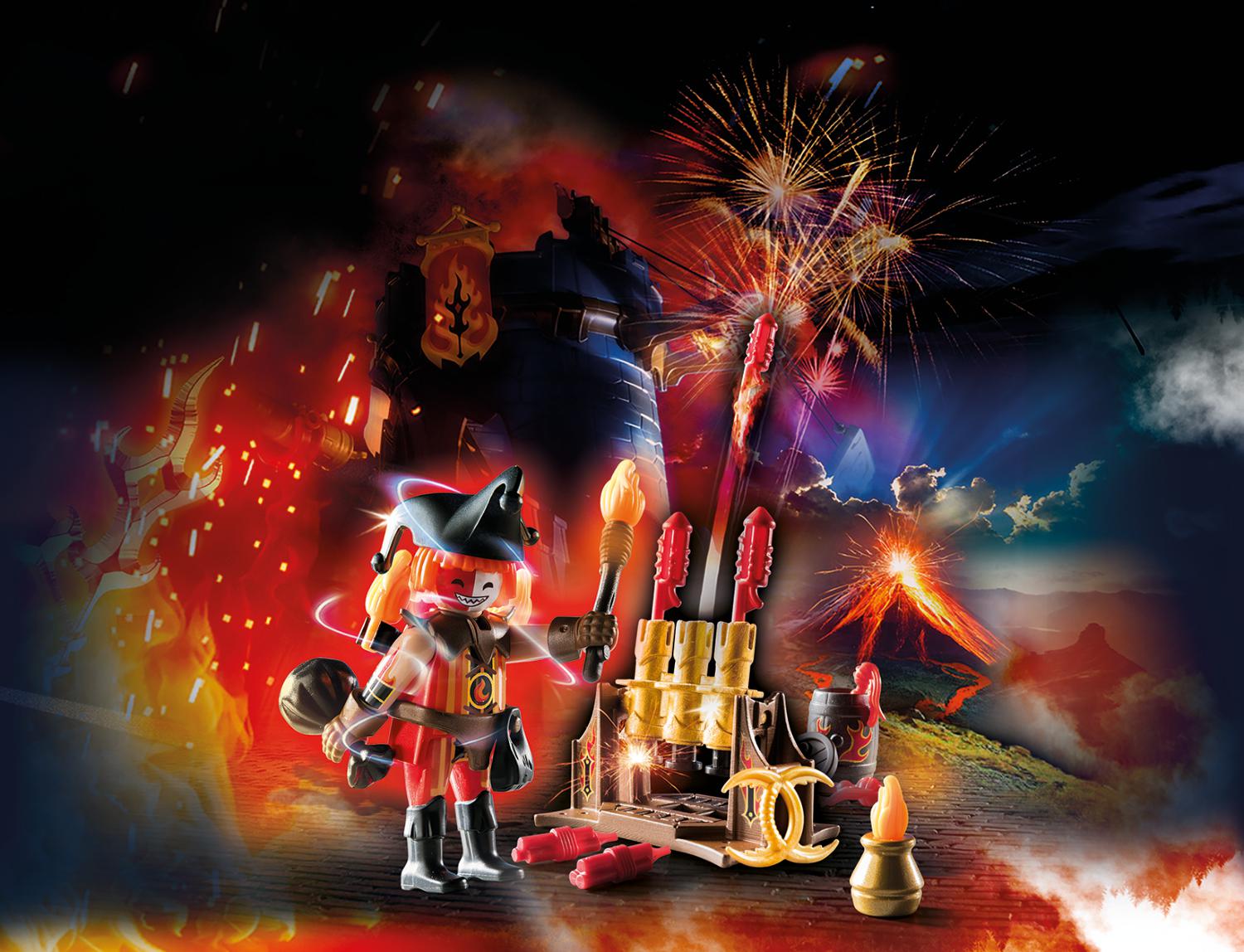L'incroyable maître du feu est à la manuvre... Il remplit les canons et assure le réapprovisionnement, même si avec ce farceur un peu fou, on se sait jamais quelle surprise il réserve. Burnham Raider Maître du feu avec support pour feux d'artifices et des accessoires.