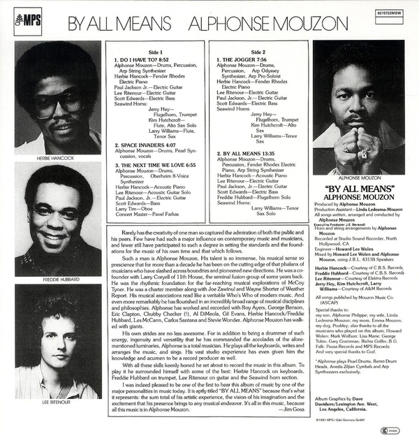 Réédition de l'album jazz-funk-disco des années 80 de la légende de la batterie Alphonse Mouzon. Réédition de l'album d'Alphonse Mouzon de 1981, « By All Means », avec Herbie Hancock, Freddie Hubbard et Lee Ritenour. L'album est un classique de l'époque, mêlant funk, disco et créativité improvisée. Au moment de son décès en 2016 à l'âge de 68 ans, le batteur, compositeur et multi-instrumentiste Alphonse Mouzon était depuis des décennies une force majeure dans les domaines du jazz, de la fusion, du R&B et de la pop. Le début des années 80 était une époque où Mouzon jouait avec le disco et canalisait le funk. Son amalgame musical était loin de la marque Saturday Night Fever, il apportait plus de funk, plus de soul, plus de créativité spontanée dans le mix. Pour « By All Means », Mouzon a réuni des musiciens maîtrisant pratiquement tous les styles musicaux. La section rythmique appartenait au who's who de la scène des studios de Los Angeles.