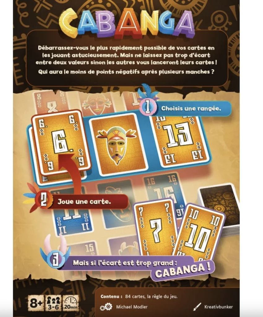 "Débarrassez-vous le plus rapidement possible des cartes que vous avez en main en les plaçant astucieusement car elles vous rapporteront des points négatifs à la fin du jeu. Mais tout ceci serait trop simple si les autres personnes autour de la table ne vous refilaient pas de cartes lorsqu’un trou se forme entre deux valeurs !_x000D_ Qui aura le moins de points négatifs après plusieurs manches et gagnera sur un dernier ""Cabanga"" ?_x000D_ "