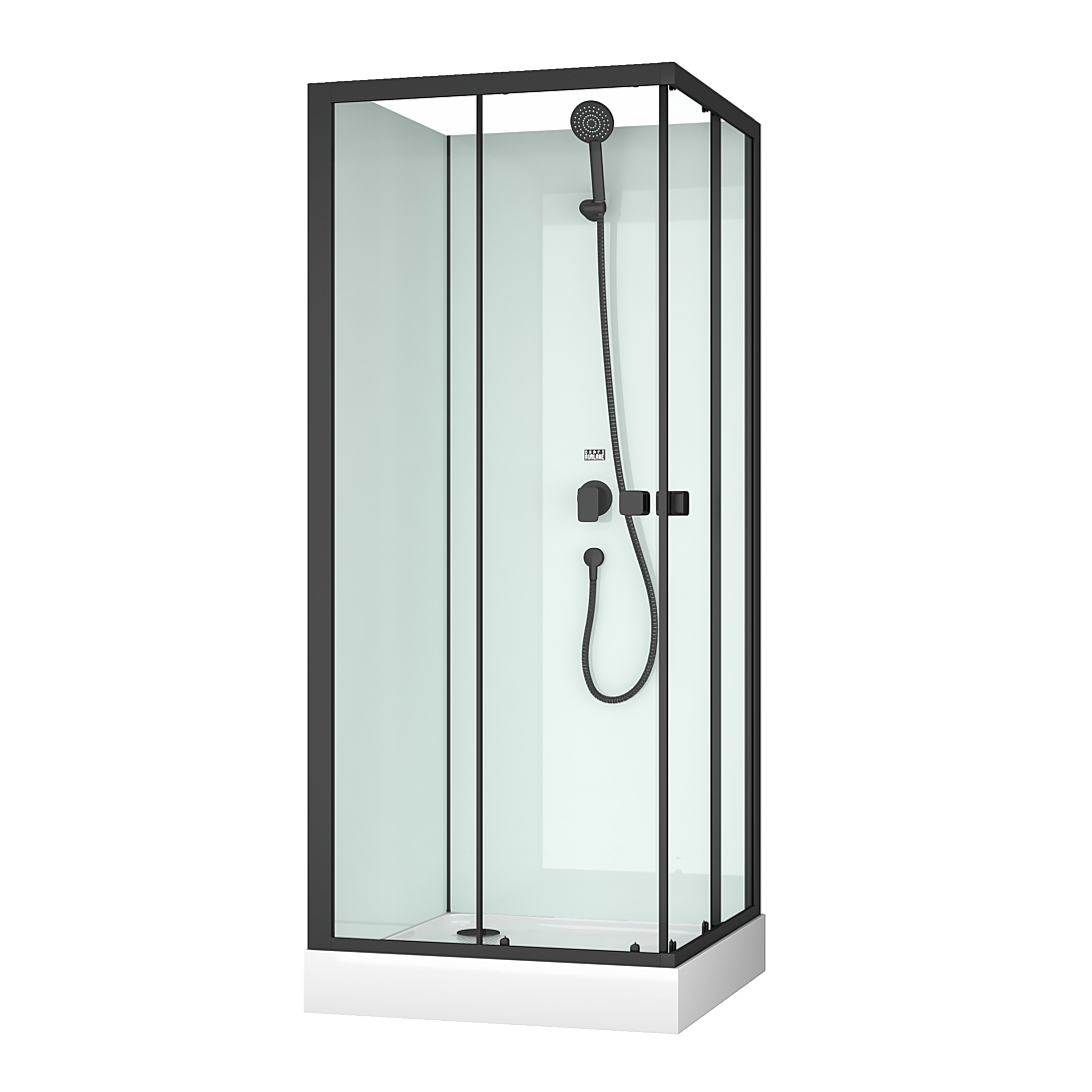 Caractéristiques techniques : Structure en aluminium noir mat 2 Portes coulissantes en verre trempé (4 mm) Poignées de porte noir mat Fonds en verre trempé blanc (4 mm) Douchette à main anticalcaire noir mat avec flexible à double agraphage Support de douchette inclinable Mitigeur mécanique Receveur renforcé en acrylique blanc (Hauteur : 12.5 cm / Charge max. 150 kg) Bonde 60 mm (capot noir mat) Fonds non réversibles Dimensions : 80x80x200 cm Dimensions complémentaires : Hauteur receveur + parois + douchette : 199,5 cm Hauteur paroi + receveur : 192,5 cm Hauteur receveur : 12.5 cm Hauteur paroi : 180 cm Largeur ouverture de porte : 39 cm