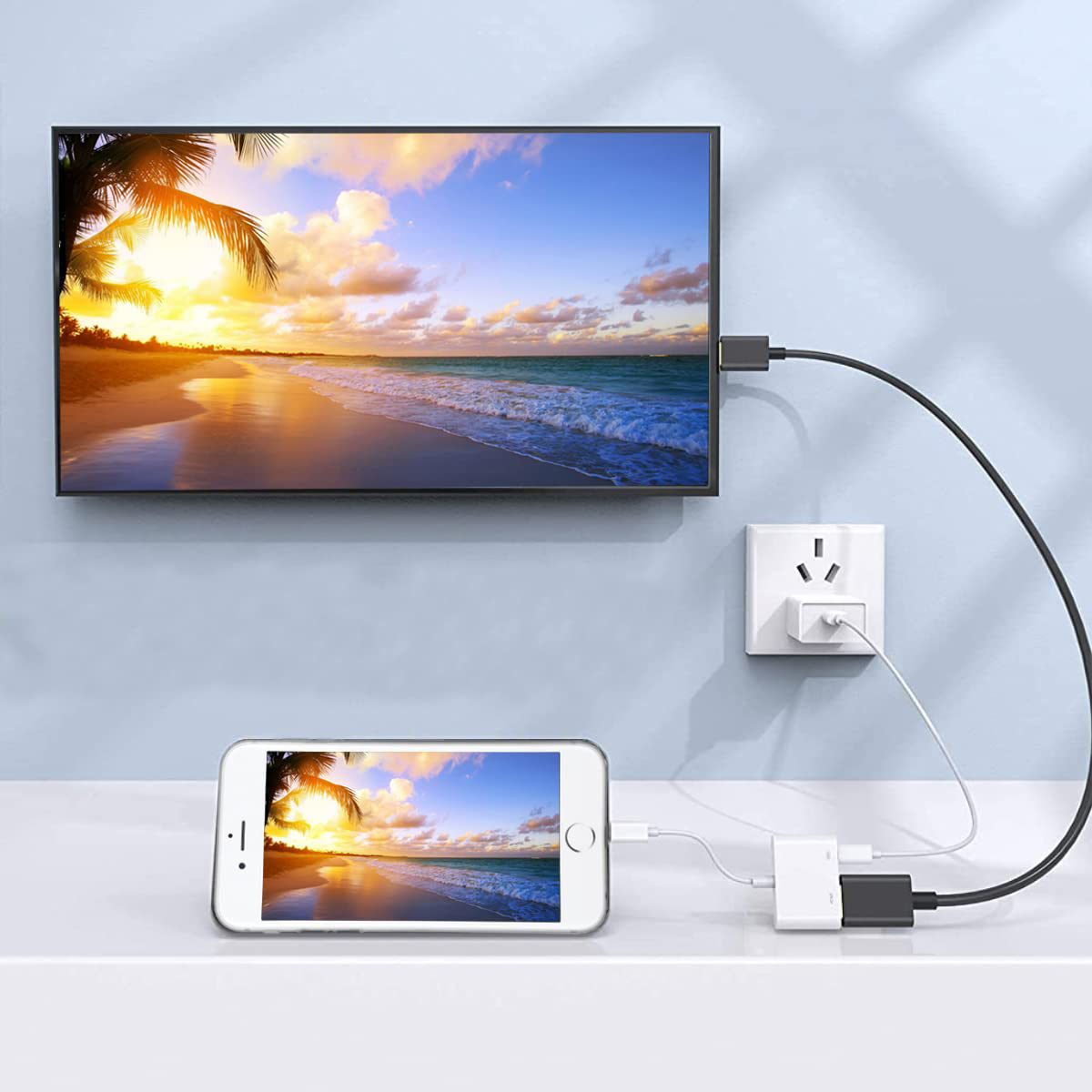 Cable Adaptateur Lightning vers HDMI AV numérique TV convertisseur pour iPhone 5 SE -Visiodirect- Cet adaptateur Lightning vers HDMI prend en charge la mise en miroir du contenu affiché sur votre téléphone et votre tablette, y compris les images, les films, les jeux, les applications, les présentations, les sites Web, les diaporamas et bien plus encore, sur votre téléviseur/projecteur/moniteur HDMI ; prend en charge une résolution HD jusqu'à 1080p pour un plaisir visuel haute définition.