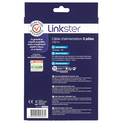 | Libellé | Câble d'alimentation 3 pôles - 1,5m - Sélection d’Experts - Linkster |