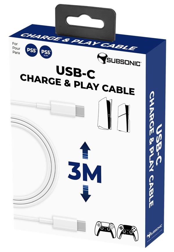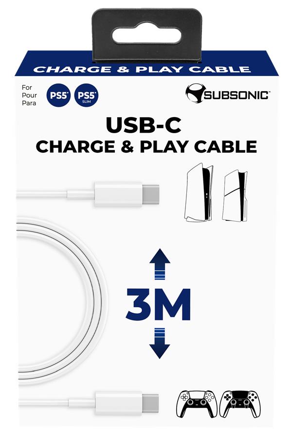 Câble de charge USB-C / USB-C pour manette PS5. Conçu pour la PS5 Slim qui possède 2 ports USB-C en façade Permet de recharger tous les appareils équipés d'un port USB-C (manette PS5, smartphone) à partir d'une sortie USB-C (PS5, PS5 Slim, PC, voiture, etc.) - Longueur 3 mètres - Charge et transfert de données - Compatible avec les manettes Dualsense et Dualsense Edge.