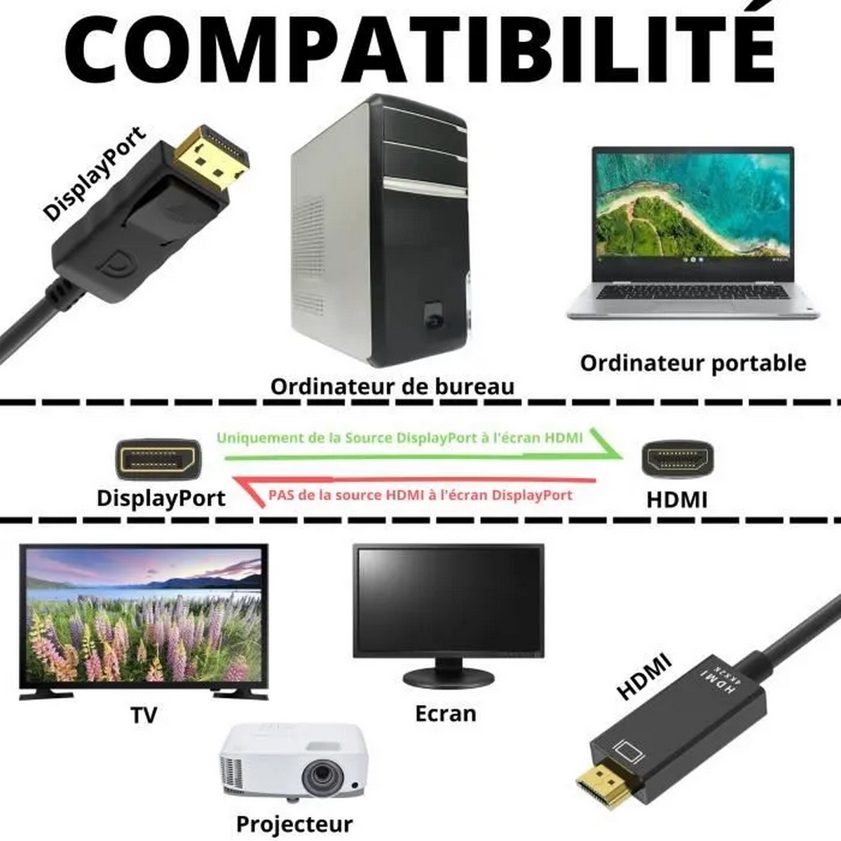 | Libellé | Câble DisplayPort vers HDMI 1,8m Noir DP mâle vers HDMI mâle uni-directionnel 4k à 30 Hz 1920x1200 1080p plaqués Or - Visiodirect |