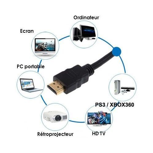 Passer le carrousel d'imagesCâble HDMI universel permettant de connecter tout appareil (Lecteur BluRay, PS3, Ordinateur...Etc.) disposant d'un port HDMI à un écran de télévision ou d'ordinateur disposant d'un port HDMI classique.