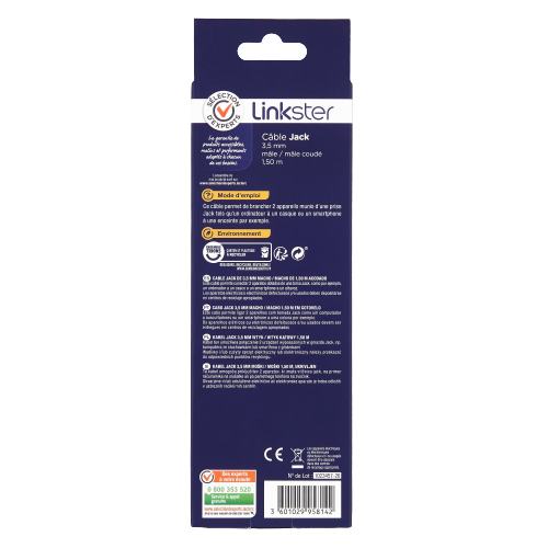 | Libellé | Câble jack 3,5mm mâle/mâle coudé - 1,5m - Sélection d’Experts - Linkster |