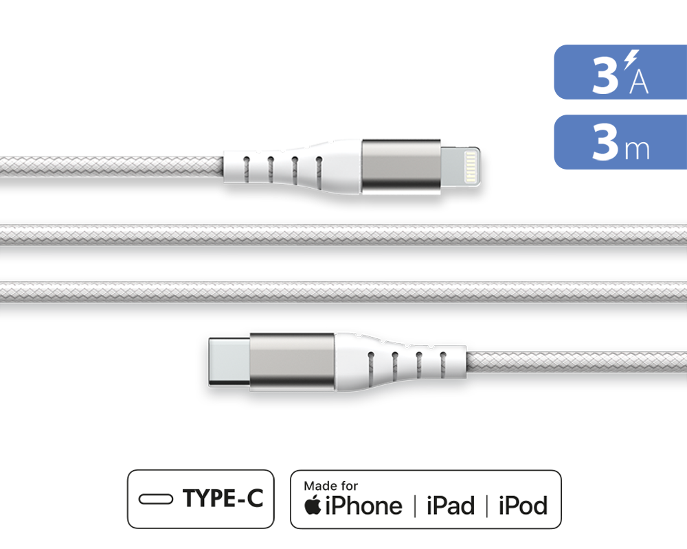 Câble USB C / Lightning 3A 3m PD 60W + Garantie à vie + Guide d'utilisation/Sécurité/Garantie