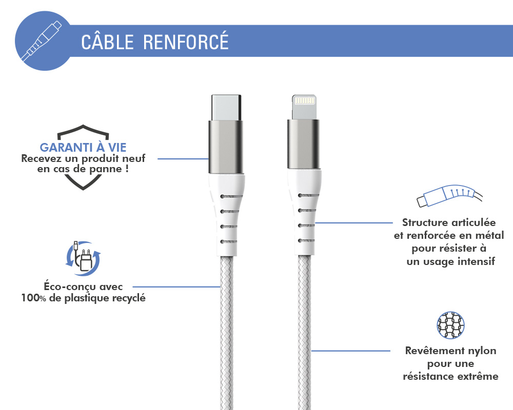 | Accessoires inclus | Câble USB C / Lightning 3A 3m PD 60W + Garantie à vie + Guide d'utilisation/Sécurité/Garantie |