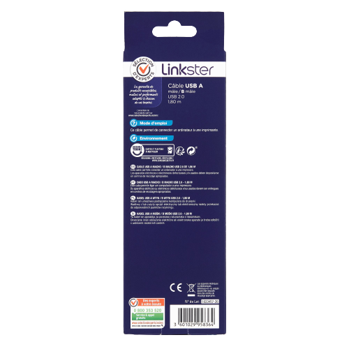| Libellé | Câble USB A mâle/B mâle USB 2.0 - 1,8m - Sélection d’Experts - Linkster |