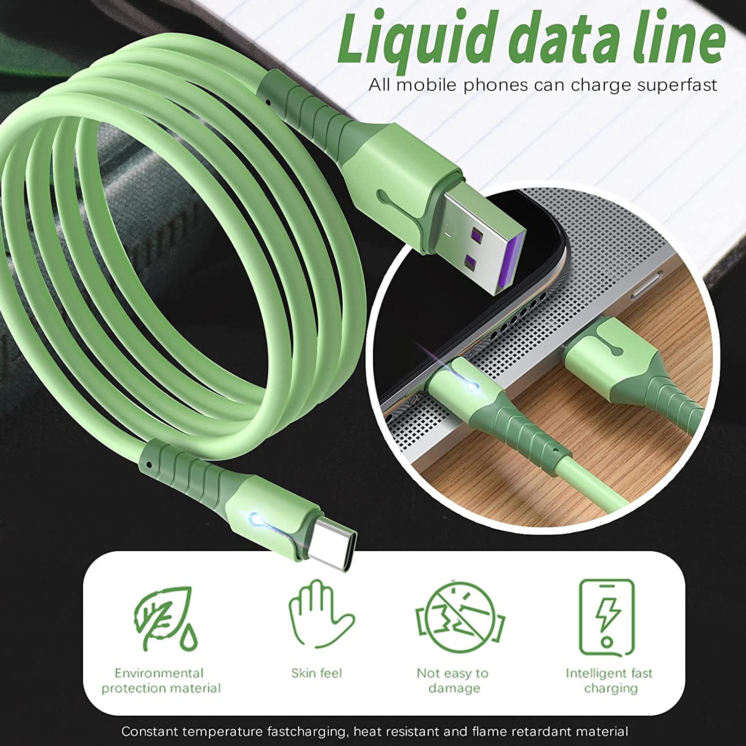 Description : Cable USB-Type C Fast Charge 3A Silicone Vert 2m Pour Samsung A13 / A33 / A53 / S22 / S22 Plus / S22 Ultra Little Boutik®