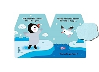 Quelqu'un lui fait coucou derrière le nuage... C'est petit goéland ! Petit manchot entend un drôle de bruit derrière le rocher... Oups, son petit frère est tombé ! Dans l'eau, petit manchot s'amuse avec les vagues. Que va-t-il attraper ? Des petits poissons bien cachés ! Qu'est-ce que maman cache sous son aile ? Son doudou cachalot ! Au dodo, petit manchot !