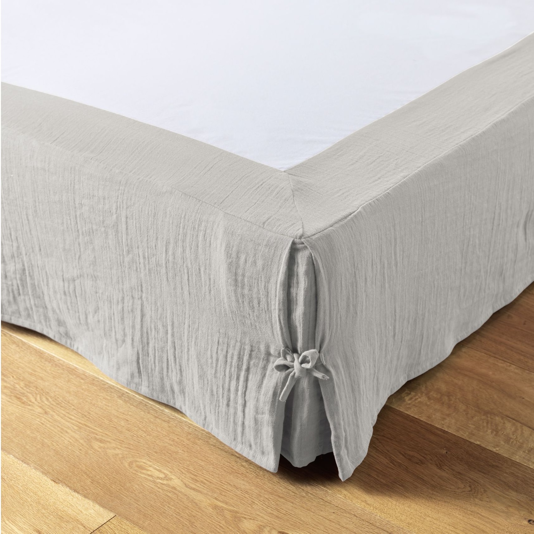 Cache-sommier en gaze de coton qui se mariera à la gamme complète Gaïa : Housse, drap housse, taies, rideaux Dimensions : largeur 140 x longueur 190 cm (lit 2 personnes) , hauteur du volant 30 cm. Matière : 100 % double gaze de coton (74 fils/cm²). Couleur : nuage Finition : à nouettes. Label OEKO-TEX. La gaze de coton est une matière douce et confortable, qui s'inscrit dans la tendance des matières naturelles et faciles à vivre. Le label Oeko-Tex est un label indépendant visant à garantir le respect de l'environnement et la santé de l'utilisateur. Il garantit l'absence de substances nocives pour la santé et pour l'environnement tout au long du processus de fabrication. Lavage à 40°, sèche linge possible. Naturellement gaufré, ce cache-sommier en gaze de coton ne nécessite pas de repassage.