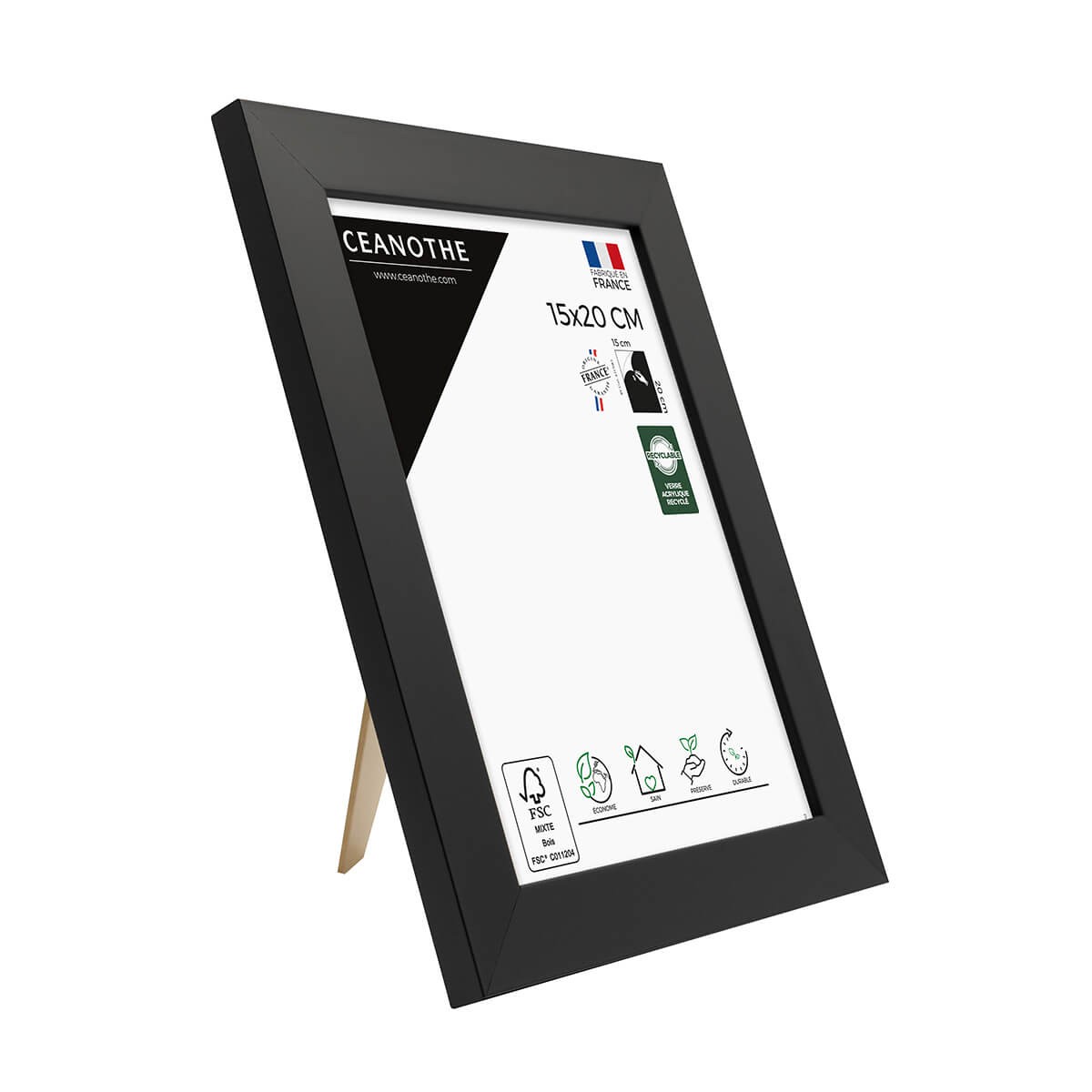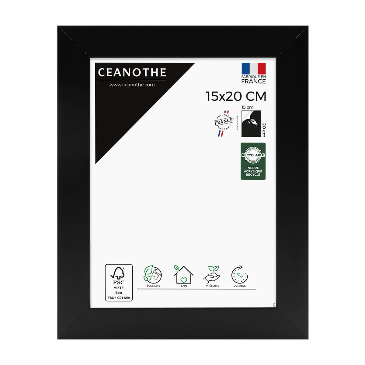 Baguette et dos en bois fsc® de forêts gérées durablement verre acrylique recyclé à 70% léger et résistant (film protecteur à retirer recto-verso) recyclable ce cadre à la finition mate, dispose d'une cravate pour être posé et d'un système d'accroches au dos pour être fixé au mur à l’horizontale comme à la verticale.