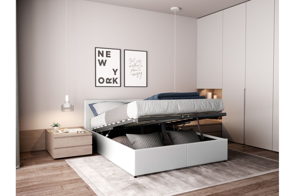 Très pratique, ce lit coffre dispose d'un sommier relevable qui vous permet de profiter d'un grand espace de rangement. Ce lit deux places en tissu ou siimili est disponible en 140 x 190 cm et 160 x 200 cm et est vendu avec son sommier à lattes. Le matelas n'est pas inclus. Livré non monté, ce lit est à assembler.