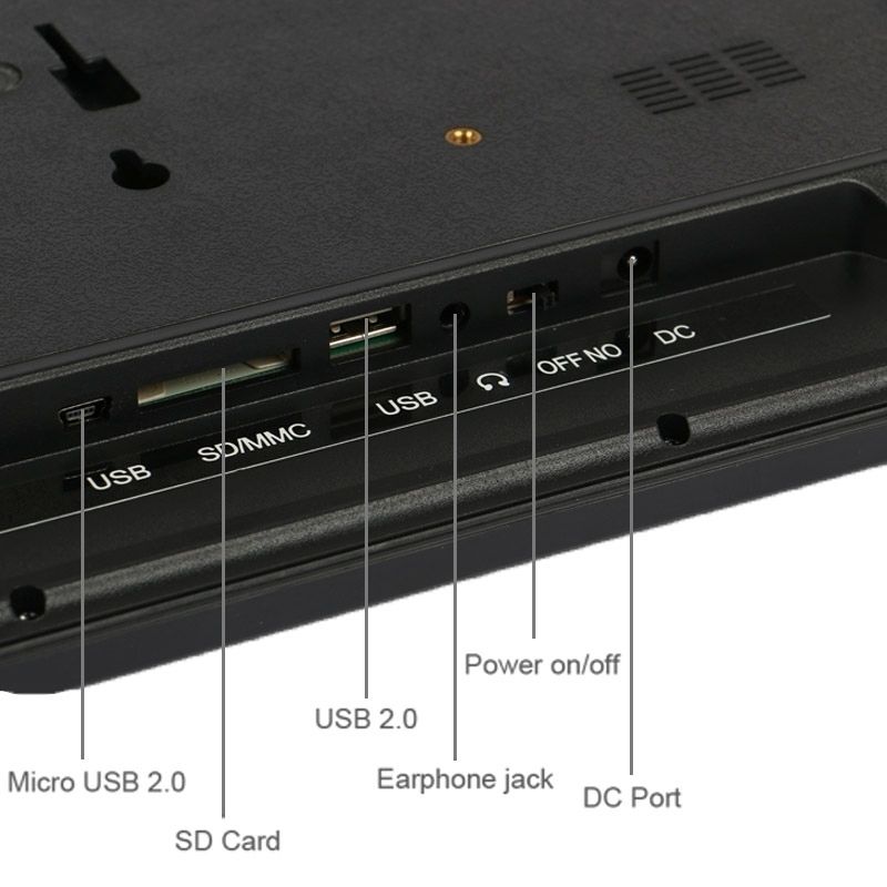 Sa connectique fournie lui permet de visionner des images directement à partir de votre appareil photo ou de votre ordinateur grâce au port USB. Son lecteur de carte SD/MS/MMC permet d'y connecter une carte TF provenant par exemple de votre téléphone portable.