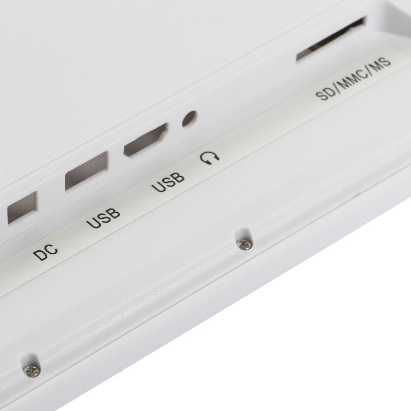 Fin et élégant, ce cadre photo séduit par son impressionnant design et son esthétique incomparable. Il fascine par son écran lumineux de 17 pouces qui offre une résolution de 1440 x 900 pixels. Il dispose d'un système audio performant qui vous garantit une qualité sonore irréprochable grâce à ses deux haut-parleurs. Son lecteur audio peut lire les fichiers MP3 et WMA. Il supporte les cartes mémoire de type SD, MS ou MMC. La capacité de ces dernières peut atteindre 16 Go. Vous pourrez donc y stocker vos films et fichiers préférés. Son lecteur vidéo prend en charge les formats MPEG1, MPEG2, MPEG4 et RMVB. L'autre atout de ce lecteur multimédia demeure sa connectique. En effet, il présente un port USB compatible OTG. Il possède également un mini-port USB, un connecteur DC, un port écouteur et plusieurs adaptateurs.