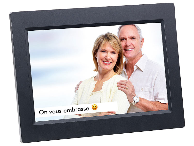 Où que vous soyez, envoyez des photos sur le cadre numérique ! Partagez vos moments mémorables avec vos proches depuis n'importe quel endroit du monde. Connectez le cadre photo à Internet en wifi. Une application gratuite vous permet alors d'envoyer vos photos sur le cadre, éventuellement accompagnées d'un message personnalisé. Et tout cela que vous vous trouviez dans la même pièce ou à l'autre bout du monde ! C'est idéal pour les grands-parents qui aiment avoir sous les yeux les dernières photos de leurs petits-enfants, mais aussi des photos de vacances ou de famille. Même avec les seniors qui ne sont pas complètement à l'aise avec l'informatique, la magie opère : c'est vous qui transmettez les images à afficher. Surtout, le cadre offre une qualité d'image remarquable sur l'écran tactile IPS. Écran tactile IPS haute résolution 25,7 cm / 10,1" Résolution : 1280 x 800 pixels, format 16:9 Affichage en diaporama, vitesse réglable Compatible réseau Internet sans fil : wifi IEEE 802.11b/g/n Transmettez les photos de votre smartphone ou tablette à partir de n'importe quel endroit dans le monde Application gratuite "Frameo" pour Android (à partir de 4.1) et iOS (à partir de 8.0) Mémoire interne : 8 Go Import d'images possible également à partir d'une carte MicroSD jusqu'à 32 Go (non fournies) Formats compatibles : JPEG, BMP, GIF, PNG Interfaces : fente MicroSD, prise d'alimentation secteur Alimentation : adaptateur secteur 230 V (longueur de câble : 175 cm) Dimensions : 267 x 196 x 27 mm, poids : 617 g Cadre photo connecté avec adaptateur secteur, pied de support et mode d'emploi en français