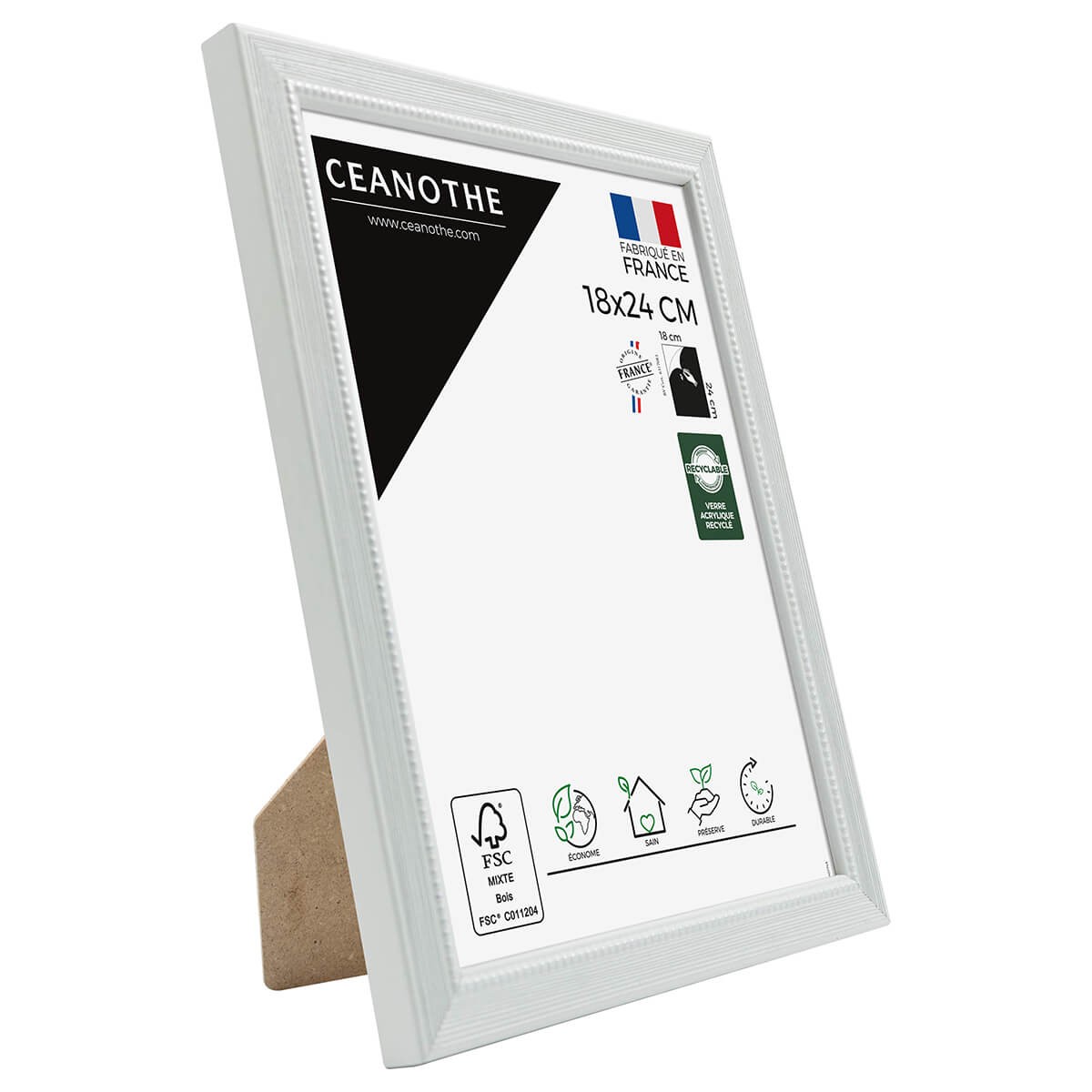 Cadre photo en bois massif raffiné et élégant, Perle gris 18x24 cm allie la délicatesse d'une perle fine à l'aspect chic du gratté argenté. Baguette en pin FSC, fabriqué en France. Ce cadre dispose verre acrylique recyclé à 70%, léger et très résistant, d'une cravate pour être posé et d'un système d'accroches au dos pour être fixé au mur à l'horizontale et à la verticale. Dimensions (LxPxH) : 26,5x2x21 cm