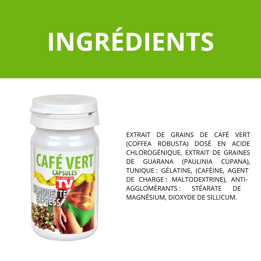 CAFE VERT MINCEUR EN CAPSULES Nettoie le corps Peut aider à réduire votre poids jusqu'à 12 kg en seulement 3 semaines Accélère la combustion des graisses corporelles Le café vert est une source énergétique bien connue. Les scientifiques ont fait une découverte importante: les principes actifs du café vert possèdent de fortes propriétés amincissantes et lipolytiques. Il n'est pas possible de boire autant de café vert pour obtenir des effets similaires à ceux d'une seule capsule café vert. Les principes actifs de la capsule dessèchent les cellules adipeuses et accélèrent la combustion des graisses du corps. La recherche scientifique confirme maintenant ce que les indigènes des forêts équatoriales d' Amazonie connaissaient déjà il y a plus de 1000 ans : le café vert contient des substances essentielles pour l'organisme. Les principes actifs du café vert nettoient et épurent le corps assurant ainsi parallèlement l'élimination ciblée des graisses. Cela explique l'impressionnant effet amincissant des capsules café vert. C'est une bonne nouvelle pour ceux qui ont des difficultés à mincir parce qu'ils n'arrivent pas à se priver de leurs plats favoris. Il suffit de prendre chaque jour 2 capsules le matin avec un grand verre d'eau. Mangez équilibré selon vos envies. Les principes actifs peuvent aider à réduire votre poids de 12 kg en seulement 3 semaines. Caractéristiques : - 2 capsules le matin - Caféine : 22,50 mg pour 2 capsules - Nettoie le corps - Dessèche les cellules adipeuses - Possède de fortes propriétés amincissantes et lipolytiques - Accélère naturellement la combustion des graisses corporelles Contenu du flacon - 60 capsules de café vert