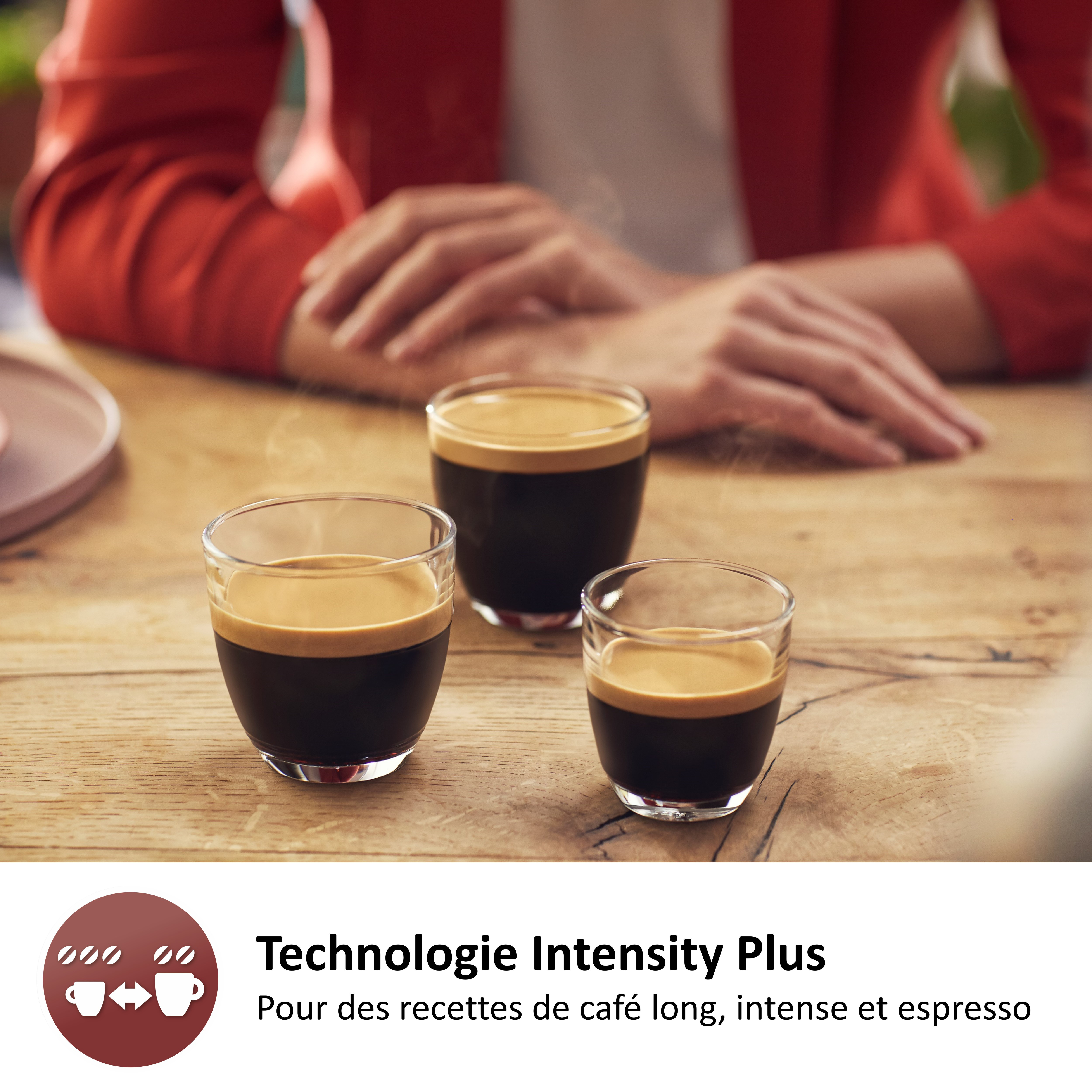 Plus produit - Intensity Plus pour des recettes de café long, intense et espresso - Consommation d'énergie réduite et plus de matériaux recyclés Crema Plus, pour une couche de mousse de crème plus fine et onctueuse - Bec verseur ajustable s'adaptant à la tasse ou mug de votre choix - La fonction Démarrage instantané prépare votre café dès que la machine est chaude - Glissière intuitive pour préparer votre café préféré en toute simplicité - Machine testée plus de 10 000 fois afin de garantir une qualité constante - La seule machine à café à dosettes préparant 2 tasses à la fois - Bac d'égouttement amovible pour un nettoyage facile - Un grand choix de saveurs et de variétés de café SENSEO - L'indicateur de détartrage vous signale qu'un détartrage est nécessaire - Plastique recyclé utilisé : 21 %