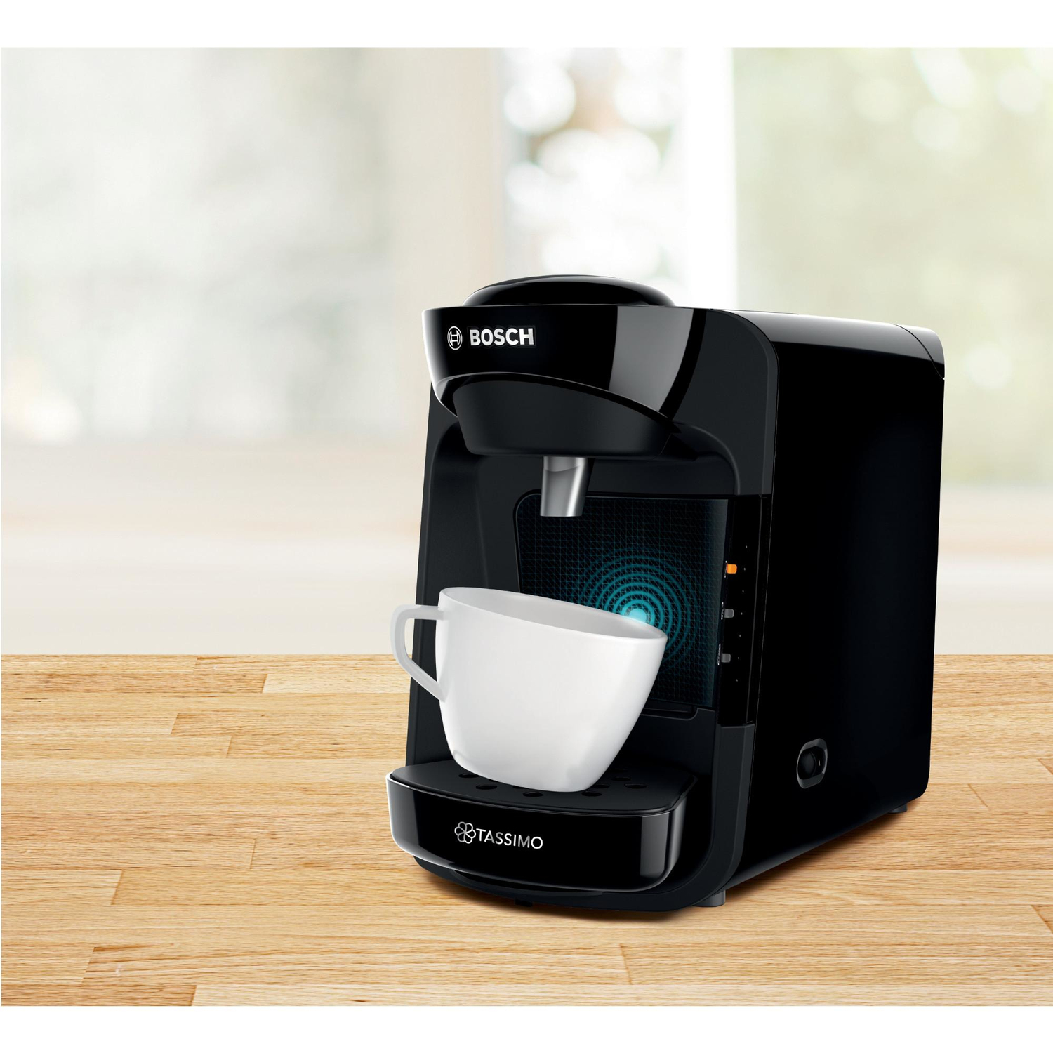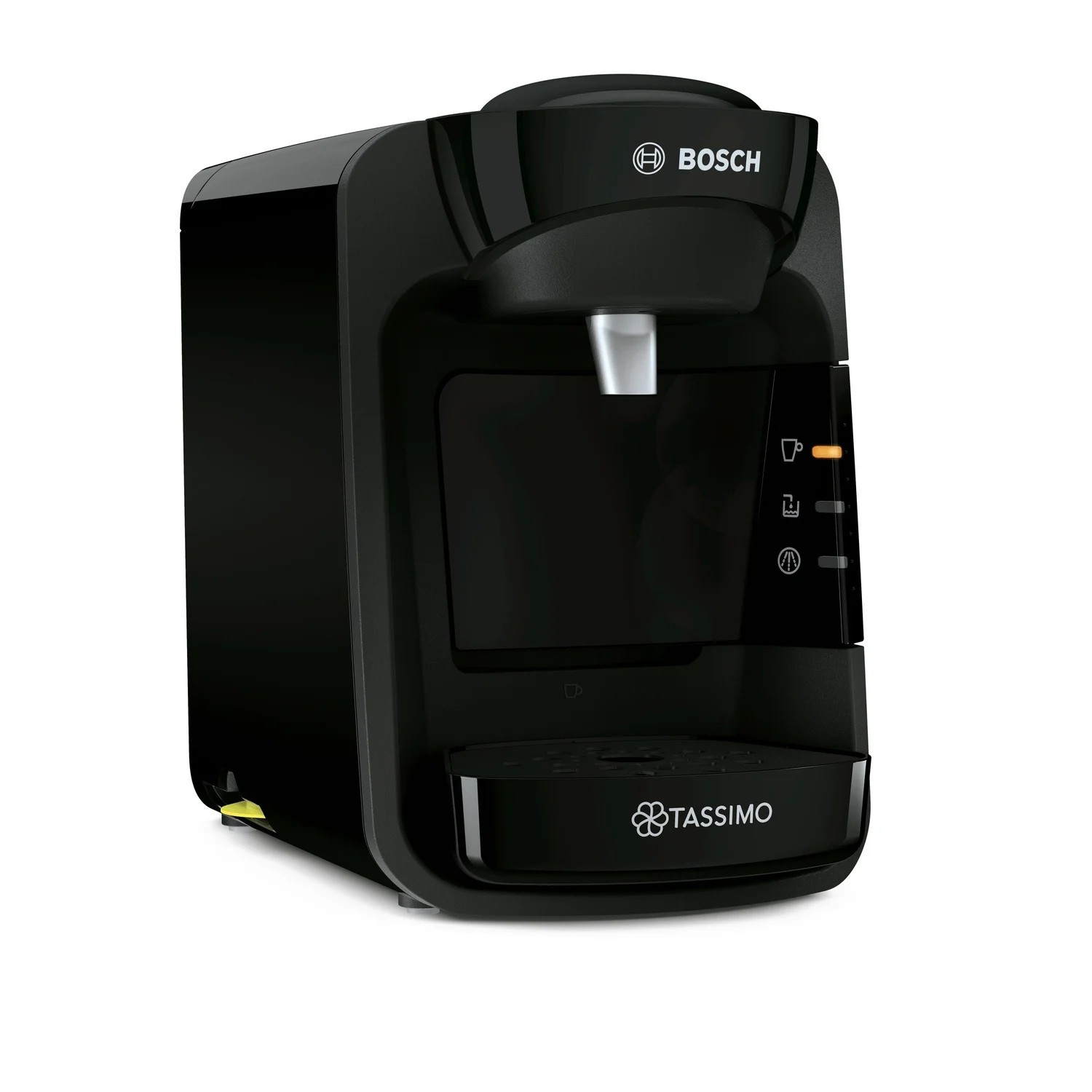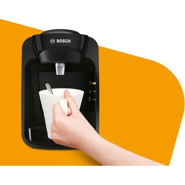 tas3102 - cafetière à dosettes 3.3bars 1300w noir - Découvrez la Tassimo Bosch TAS3102 Suny, une machine à boissons chaudes compacte et élégante conçue pour s'intégrer discrètement dans toutes les cuisines. Avec sa finition noire All Black et ses dimensions réduites, elle se glisse facilement sur un plan de travail sans l'encombrer. Grâce à la technologie IntelliBrew, elle lit automatiquement le code-barre des T-Discs pour ajuster la température, le volume d'eau et le temps d'infusion, vous offrant plus de 40 boissons variées (café, espresso, thé, chocolat, cappuccino, etc.) en un seul geste. Le système SmartStart vous permet de lancer la préparation en appuyant simplement votre tasse au fond de l'appareil, sans besoin d'appuyer sur un bouton. Préparez votre boisson en toute simplicité, sans temps de préchauffage, et changez de boisson sans transfert de goût grâce au nettoyage automatique entre deux usages.