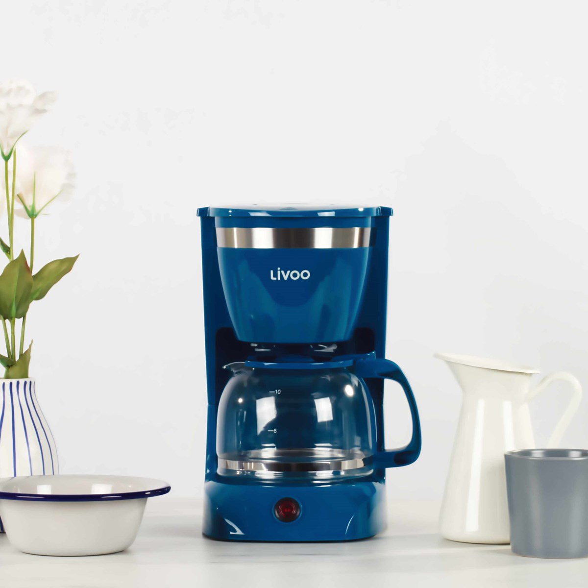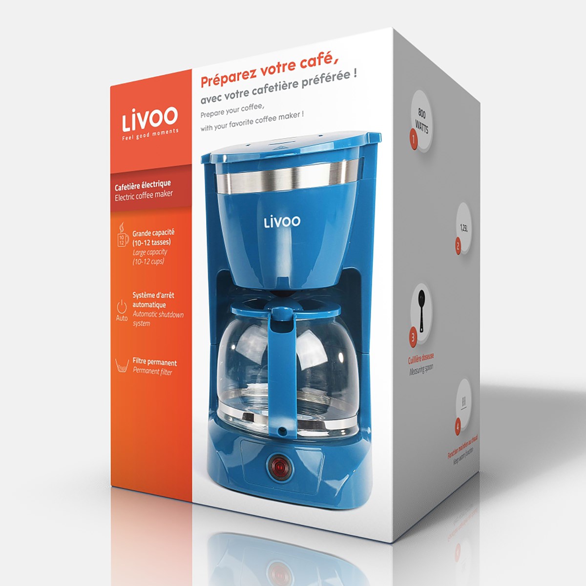 Cafetière électrique Capacité 10-12 tasses Plaque chauffante antiadhésive et fonction maintien au chaud Interrupteur marche/arrêt lumineux et système d'arrêt automatique Filtre permanent avec poignée et cuillère doseuse inclus Indicateur de niveau d'eau Système anti gouttes Carafe en verre résistant à la chaleur et compatible lave-vaisselle