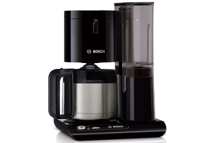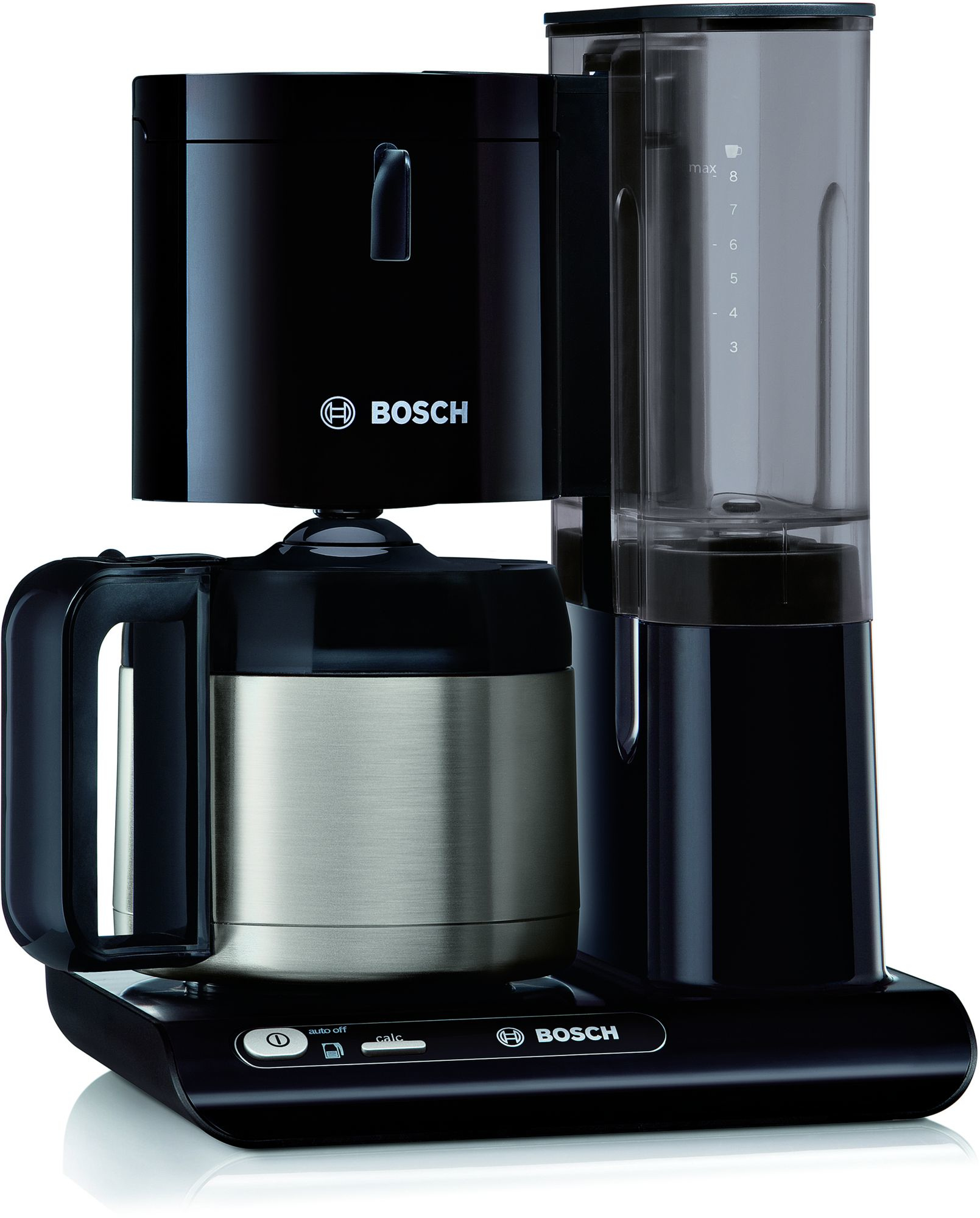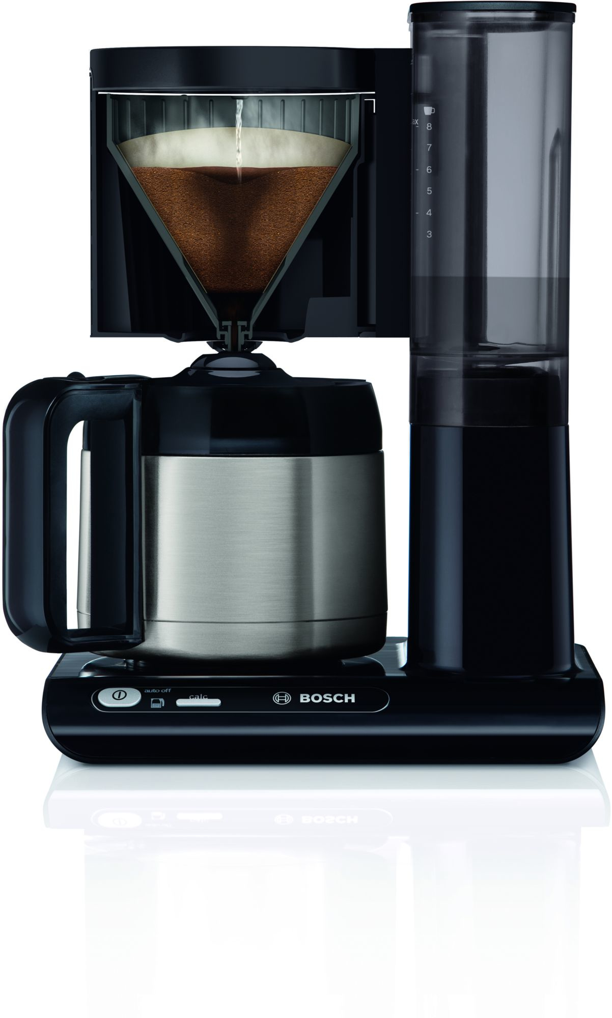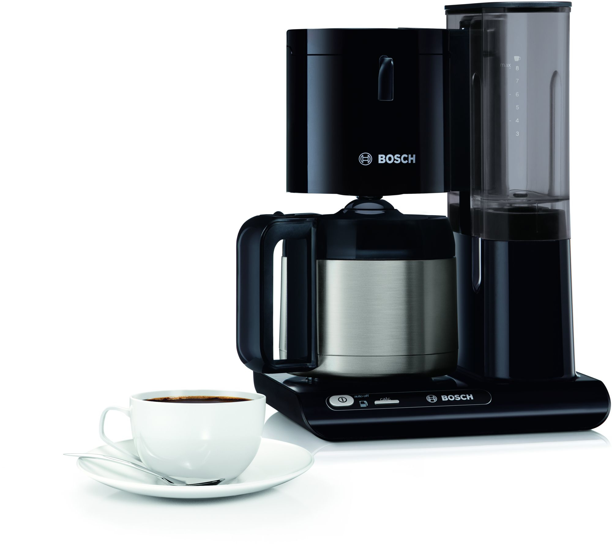 La machine à café filtre Bosch Styline TKA8A053 est une machine à café pour le café moulu et convient pour environ 8 tasses de café. l'appareil dispose d'un réservoir d'eau de 1,1 litre et d'une puissance de 1100 watts. Il existe un thermos en acier inoxydable conçu de manière à ce que le café infusé puisse rester chaud jusqu'à une température de 85 degrés.