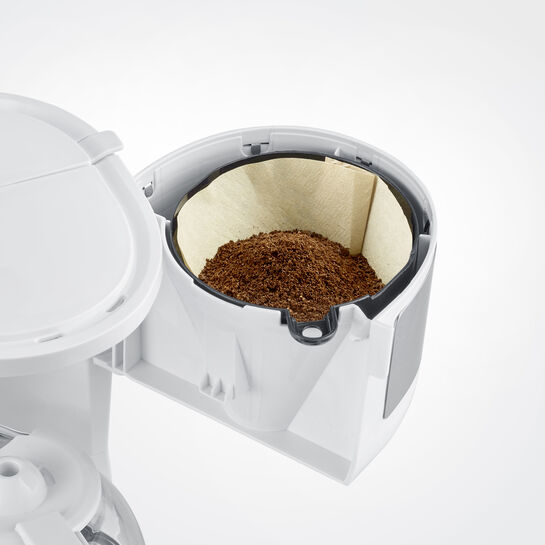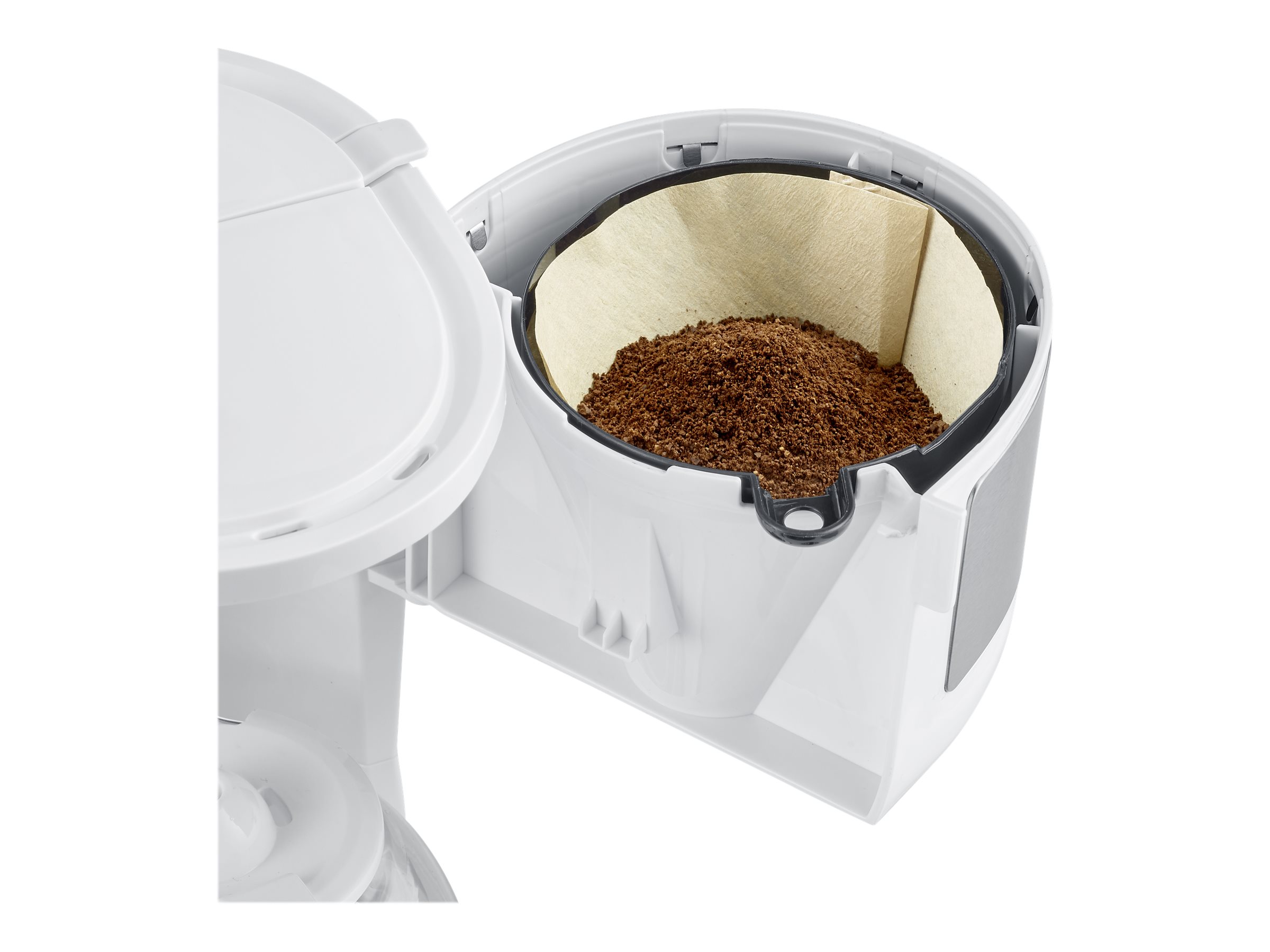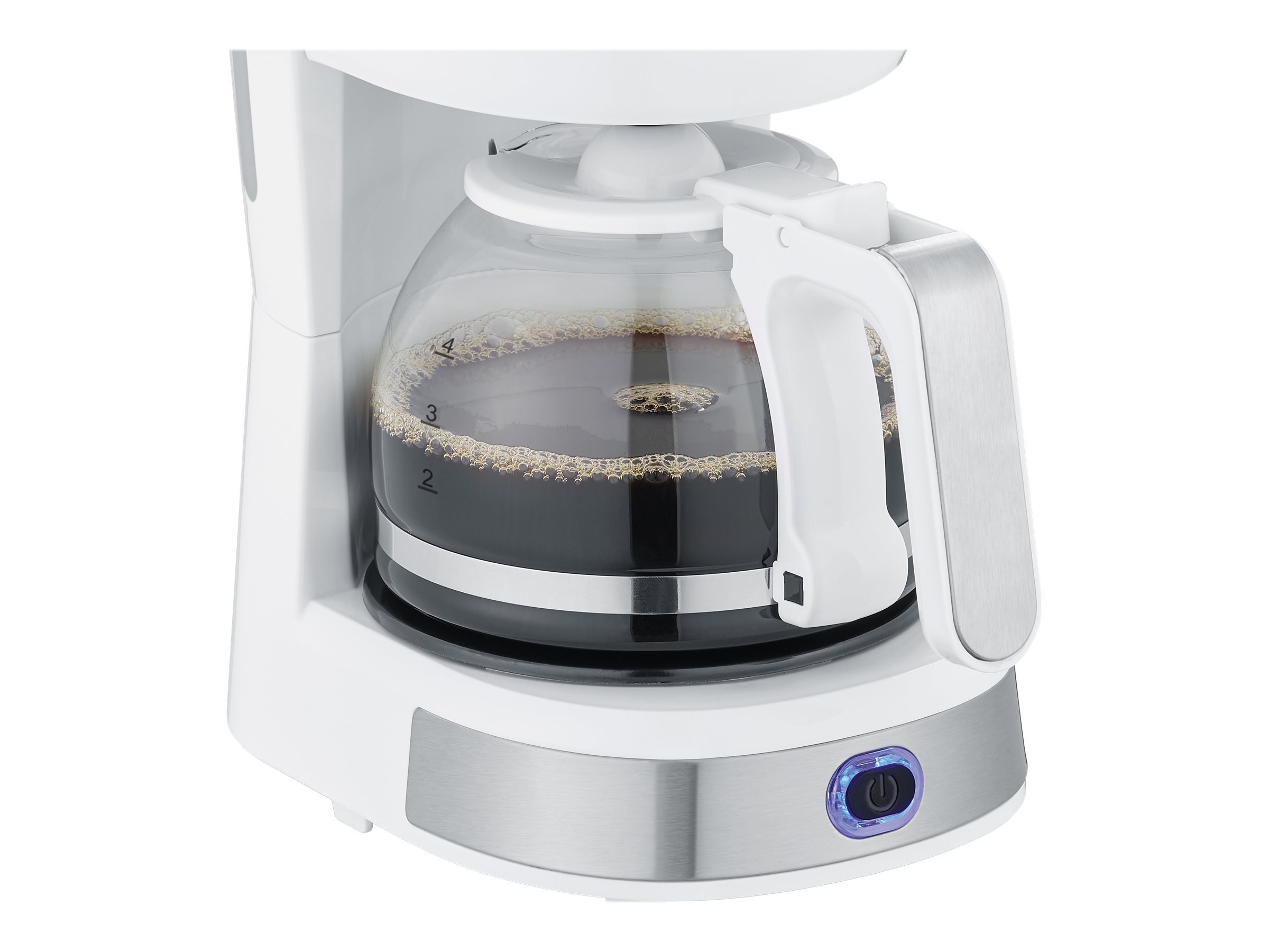 Cafetière filtre compacte. Jusqu'à 4 tasses. Filtre permanent lavable. Arrêt automatique au bout de 35 minutes. Porte-filtre pivotant et amovible avec habillage inox. Système anti-goutte. Verseuse en verre 0.45 L. Graduation sur la verseuse en verre. Niveau d'eau visible. Interrupteur marche / arrêt avec voyant lumineux. Design de qualité supérieure avec application en inox sur la poignet de la verseuse. Coloris blanc et inox brossé. Puissance 750 W