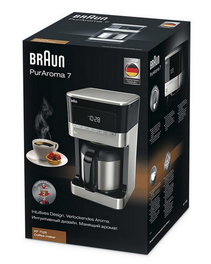 kf7125bk - cafetière filtre isotherme et programmable 10 tasses 1000w noir/inox - Cafetière filtre PurAroma 7 Braun KF7125BK.Les nouvelles cafetières filtre PurAroma 7 sont dotées d'une excellente technologie et d'un design haut de gamme. Comme toutes les cafetières Braun, elles disposent également du système OptiBrew pour une saveur maximale du café en optimisant la température, le temps de préparation et d'infusion. La carafe Aroma permet de garder le café plus chaud et plein d'arômes, plus longtemps.OptiBrew Systèm.Chaque cafetière Braun est dotée de l'OptiBrewSystem pour offrir des cafés au goût et à l'arôme incroyables. Cette technologie de Braun optimise la température et le temps d?écoulement et d?extraction pour une saveur de café incomparable. Savourez des cafés toujours parfaitement équilibrés.Une carafe en inox qui permet de garder le café au chaud pendant 6 heures.Sélection de l'arôme.Sélecteur d'arôme pour un café plus ou moins corsé.Programmation 24H.Programmation 24h pour profiter dés le réveil d'un bon café.Système anti gouttes.Système anti-gouttes, pour se servir à tous moments.Carafe thermos 10 tasses.Une carafe thermos pour conserver le café chaud pendant 6h.Ajustement 1-4 tasses.Boutons 1 à 4 tasses, de petites quantités sans compromis sur le goût.Indicateur de calcaire.Indicateur de détartrage. - Type : Programmabe et isotherme.