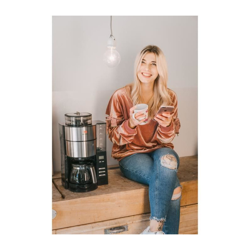 La cafetière filtre Melitta® AromaFresh dispose d‘un moulin intégré. Cela signifie que vous pouvez préparer du café filtre aromatique à partir de grains de café fraîchement moulus - Le niveau de mouture (de fin à grossier) et l‘intensité du café (doux, moyen, corsé) peuvent être ajustés en fonction de vos préférences - Le moulin peut aussi être désactivé pour vous permettre de préparer du délicieux café à partir de café pré-moulu - Design haut de gamme - Nettoyage Facile - Simple d'utilisation - Goût personnalisé