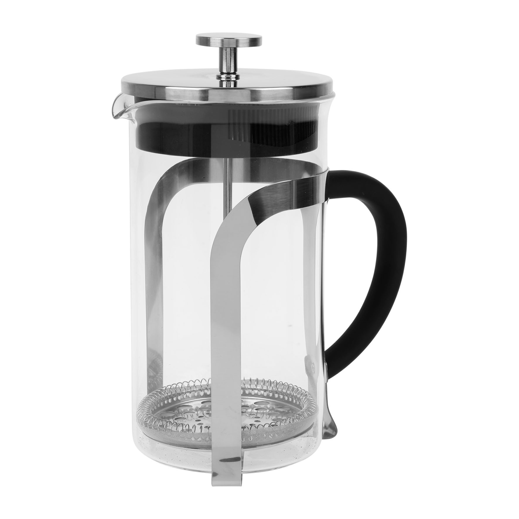 Cafetière à piston 1 L Verre Ø 11 cm H 17 cm Avec poignée plastique thermorésistante Avec couvercle en inox et plastique Avec 1 filtre inox et graduation jusqu'à 9 tasses et 1 support inox amovible.